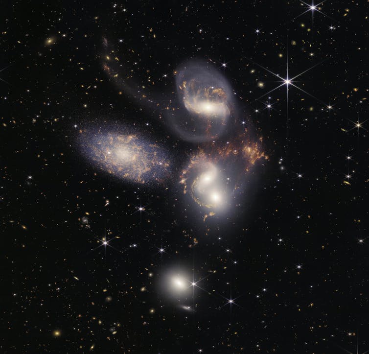 제임스 웹은 또한 페가수스 별자리에서 약 2억 9천만 광년 떨어져 있는 곳에서 합쳐지고 있는 5개의 은하 그룹인 슈테팡 5중주 (Stephan's Quintet)를 언뜻 보여주었다. 이 이미지는 또한 중심에 초거대질량 블랙홀이 있음을 암시하며 별이 탄생하고 있음을 보여준다. 데이터는 은하가 어떻게 진화하고 초대질량 블랙홀이 성장하는 속도에 대해 더 많이 알려줄 것이다.