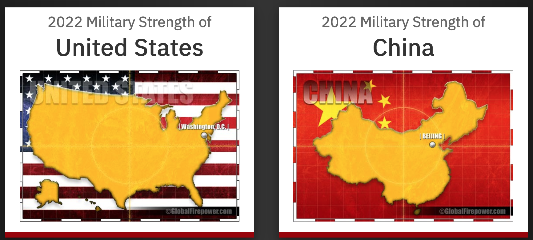 미국과 중국의 군사 전력을 이해하기 위해서는 단지 병력, 전투기, 함대 등의 숫자를 넘어 인구, 경제, 지리 등을 총체적으로 포함해야 한다. 아래 도표들은 글로벌 파이어파워 2022년 미국과 중국의 군사력 비교로 인구, 재정, 육해공, 물류, 자원 그리고 지리의 비교를 포함한다. 러시아가 비록 군사력 2위에 올라 있지만 중국은쟁의 지속가능성을 보장하는 재정과 글로벌 파워의 핵심 조건의 하나인 해군력 그리고 물자의 이동과 공급을 보장하는 로지스틱스 측면에서 러시아보다 우위에 있음에 주목할 필요가 있다.