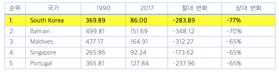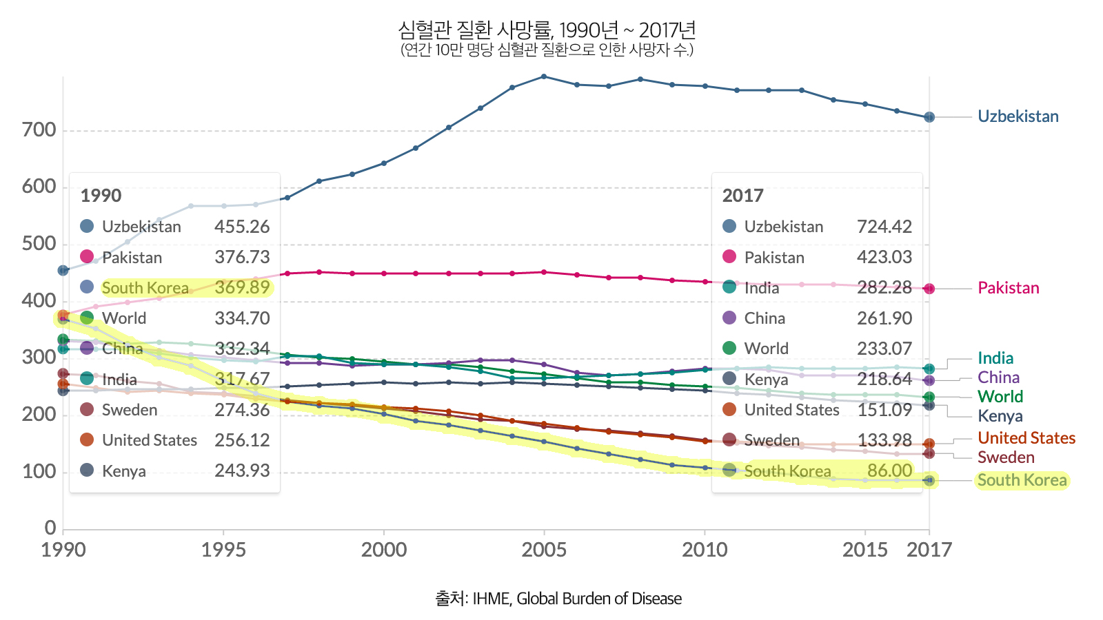 한국의 심혈관 질환으로 인한 사망자 수는 2017년 86명으로 일본(79.37명)과 페루(85.75명)에 이어 세계에서 3번째로 낮다. 아래 도표를 보면 한국은 심혈관 질환 사망자가 10만 명당 1990년 369명에서 2017년 86명으로 줄어들었으며, 상대 변화로 보면 감소 비율이 77%로 가장 높다.