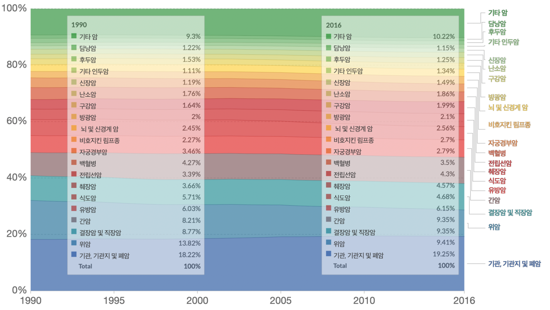 아래 차트에서 보듯이 기관지 및 폐암이 18~19%로 여러 종류의 암 중 가장 높다. 그다음으로 위암, 결장 및 직장암, 그리고 간암의 순서로 전체 중 대략 9%~9.5%를 차지한다.