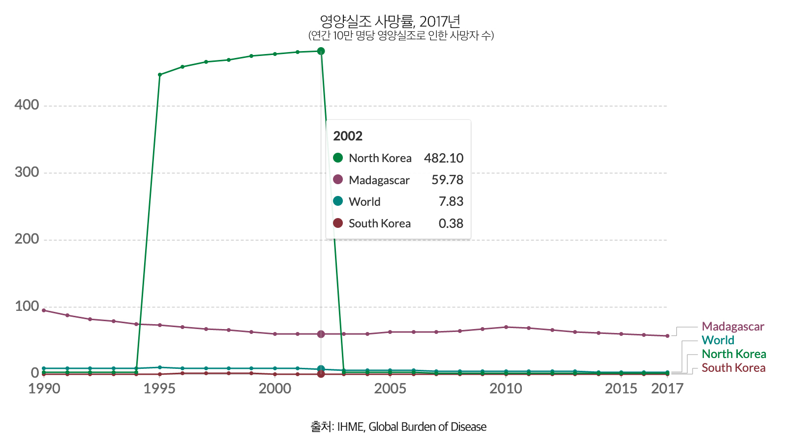 영양실조: 북한, 기근 동안 영양실조 사망률 10만 명당 480명까지 치솟아
