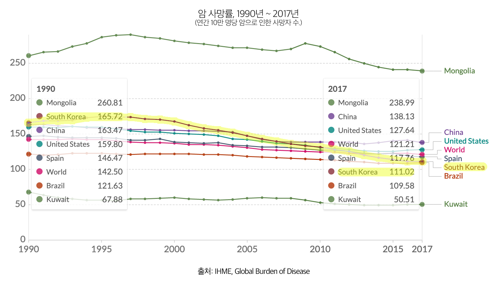 암은 한국에서 사망 원인 1위로 심혈관 질환 사망자보다 30% 정도 많다. 1990년 암으로 인한 사망자는 165명이었으며, 2017년에는 111명으로 약 33%가 감소했다. 감소율로 보면 바레인이 이 기간에 48%로 가장 높은 감소율을 보였으며, 한국의 감소율은 세계에서 8번째이다.