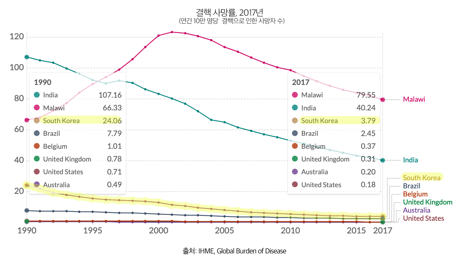 한국의 폐결핵으로 인한 사망자는 1990년 10만 명 24명에서 2017년 3.79명으로 무려 84% 감소했다. 하지만 2019년 세계보건기구에 따르면 결핵 감염자는 10만 명당 59명으로 OECD 국가 중에서 가장 높은 감염률을 보인다.