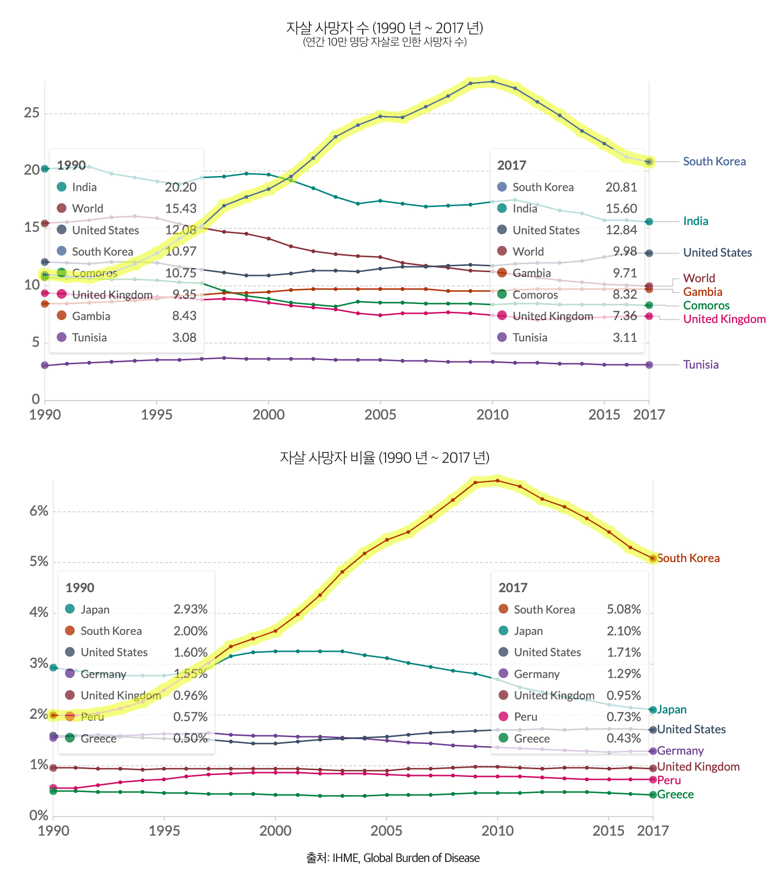 자살은 지역별로 비교하면 약 10배까지 차이가 난다. 자살률이 가장 높은 곳은 한국으로 2017년 전체 사망자의 약 5%가 자살로 사망해 0.4%인 그리스의 10배가 넘는다. 한국은 1990년 10만 명당 약 11명에서 2010년 27명으로 가장 높았고, 이후 조금씩 감소해 2017년 약 20명으로 떨어졌다. 하지만 여전히 세계에서 가장 자살 비율이 높은 나라다. 2017년 자살로 인한 한국의 사망자는 15,228명으로 암(92,548명), 심혈관 질환(66,787명), 치매(31,554명), 소화기관 질환(16,084명)에 이어 5번째로 높은 사망원인이다.