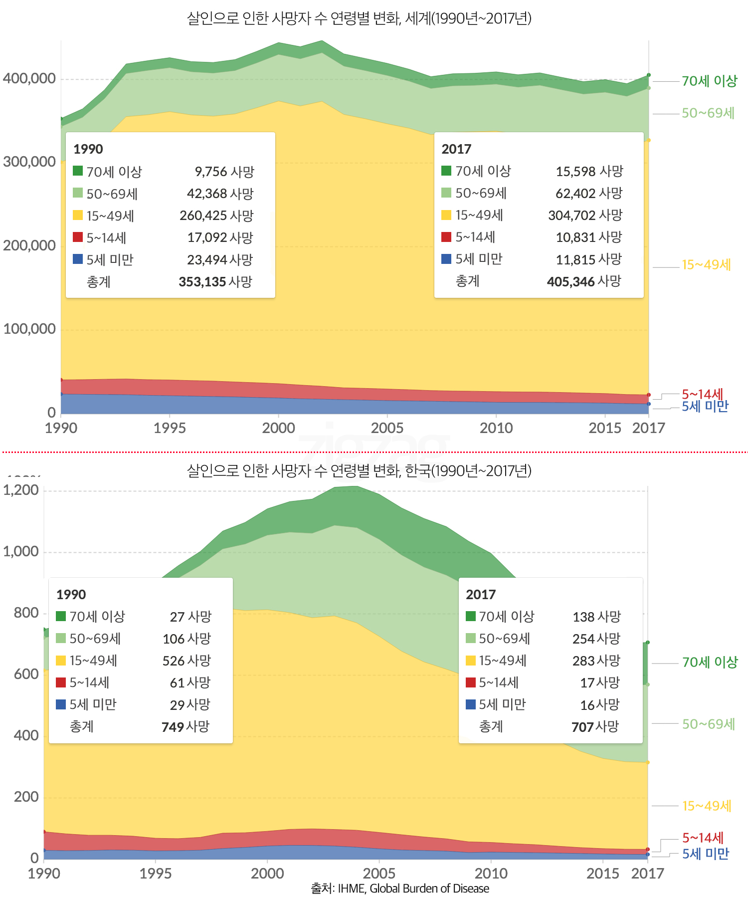 전 세계적으로 살인으로 1990년 35만 명이 사망했으며, 2017년에는 40만 명이 사망했다. 연령별로 보면 살인으로 인한 피해자의 대부분은 15세~49세 연령 집단이다. 이들은 살인으로 인한 사망자 비율의 75%를 차지하고 있다. 한국의 경우 살인으로 인한 사망자는 1990년 749명에서 2004년 1,217명으로 증가했다가 2017년에 707명으로 감소했다. 연령별로 보면 70대 이상에서 살인으로 인한 사망은 1990년 27명에서 2017년 138명으로 5배 이상 증가했다. 이 연령층의 살인으로 인한 사망자 비율 역시 같은 기간 3.65%에서 19.46%로 급증했다. 50~69세 연령층의 사망자 수는 같은 기간 106명에서 254명으로 두 배 이상 증가했으며, 전체 비율에서도 1990년 14.2%에서 35.88%로 대폭 상승했다. 살인으로 인한 사망자 숫자에서 가장 큰 부분을 차지하는 15세~49세 층의 사망자는 526명에서 283명으로 절반 수준으로 줄었으며, 그 비율도 70.16%에서 40.05%로 감소했다.