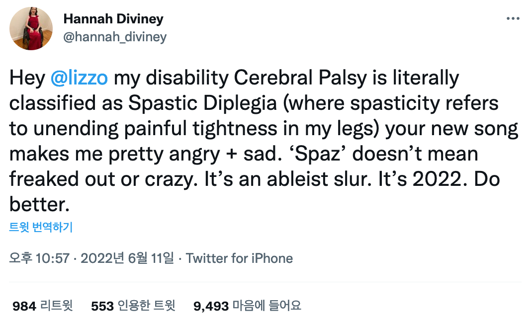 * 역자 주: 스패즈(spaz)는 원래 경련, 발작을 의미하는 스패즘(spasm)에서 온 뇌성마비라는 의미의 spastic의 줄임말이지만, 저능아 같다는 의미의 비속어로 쓰인다. 스패즈는 구체적으로 경직성 양측마비(spastic diplegia)를 일컫는 뇌성마비(Cerebal Palsy)를 비하하는 말로 미국 슬랭에서는 과도한 흥분이나 과도한 놀람 반응이나 행동을 의미하는 것으로 쓰이곤 한다. ** 역자 주: 한나 디비니는 6월 11일 자 트윗을 통해 "안녕 @리조(@lizzo), 내 장애 뇌성 마비(Cerebral Palsy)는 말 그대로 경직성 양측마비(spastic diplegia)로 분류된다(경직은 다리가 끝없이 조이는 것을 말한다). '스패즈'(spaz)는 흥분했다거나 미쳤다는 뜻이 아니다. 그것은 장애차별적 비방이다. 2022년이다. 더 잘하자."라고 밝혔다.