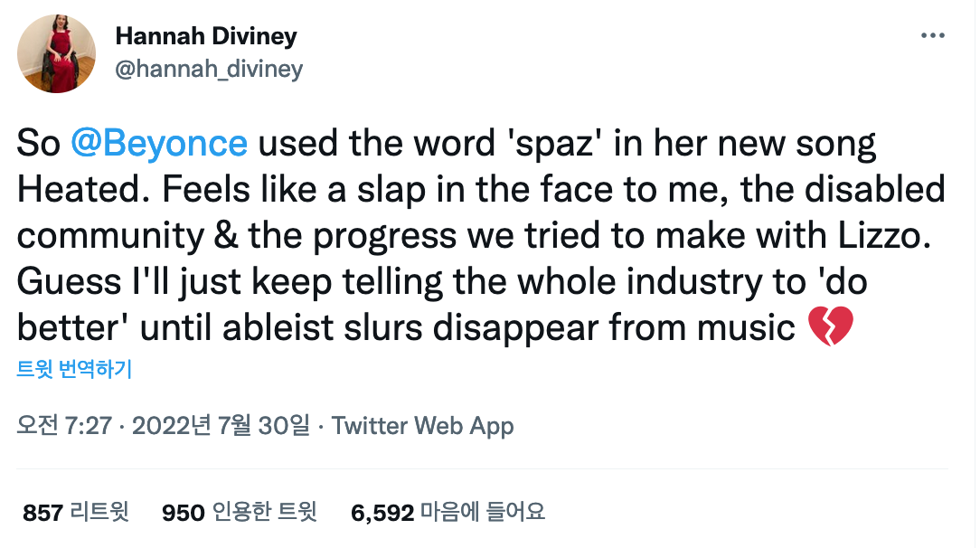 ■ 역자 주: 지난 6월 흑인 가수 리조가 신곡에서 장애인을 저능아라고 비하하는 '스패즈'(spaz)라는 장애차별적 단어를 넣은 것에 대해 호주 장애인 작가인 한나 디비니(Hannah Diviney)는 트위터를 통해 이를 비판했으며, 이 트윗은 각종 언론에 보도되었다. 리조는 디비니의 문제제기를 수용하여 곧 자신의 노래에 들어간 그 단어를 빼고 새로운 단어로 대체했다. 하지만 언론에 공론화된 이 단어는 언론의 절대적인 극찬을 받고 있는 비욘세의 새로운 앨범 '르네상스'(Renaissance)의 신곡 히티드(Heated)에 다시 등장했다. 미국 대중음악계에서 독보적인 영향력을 행사하는 비욘세는 디비니와 같은 장애인에게는 거의 절대 권력이지만 그럼에도 디비니는 비욘세의 태도에 대해 비판했으며 이것이 다시 공론화되자 비욘세는 이 단어를 곡에서 삭제하겠다고 밝혔다. 하지만 이미 공론화되었던 문제를 아무런 수정없이 무시한 것은 부주의 이상의 문제라고 비판받고 있다. 이 기사는 시드니 출신의 작가이자 장애 옹호자 한나 디비니(Hannah Diviney)가 Hireup에 처음 Six weeks on from Lizzo changing her lyrics, Beyoncé drops the same ableist slur이란 제목으로 게재한 글을 Guardian이 다시 허가를 받아 8월 1일 자 When Beyoncé dropped the same ableist slur as Lizzo on her new album, my heart sank의 제목으로 다시 게재한 것을 번역한 것이다.