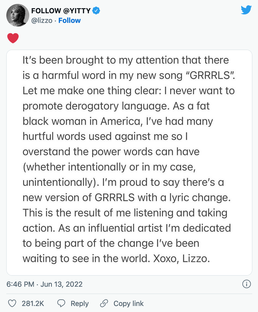 리조는 한나 디비니의 트윗과 매체들의 보도를 접하고 "뚱뚱한 흑인 미국 여성으로" 자신이 들어 온 아픈 언어를 들어왔기에 언어의 힘을 이해하며, 자신의 노래 GRRRLS에 삽입된 상처를 주는 언어가 있었음을 인정하며 가사를 수정했음을 밝히는 트윗을 올렸다.