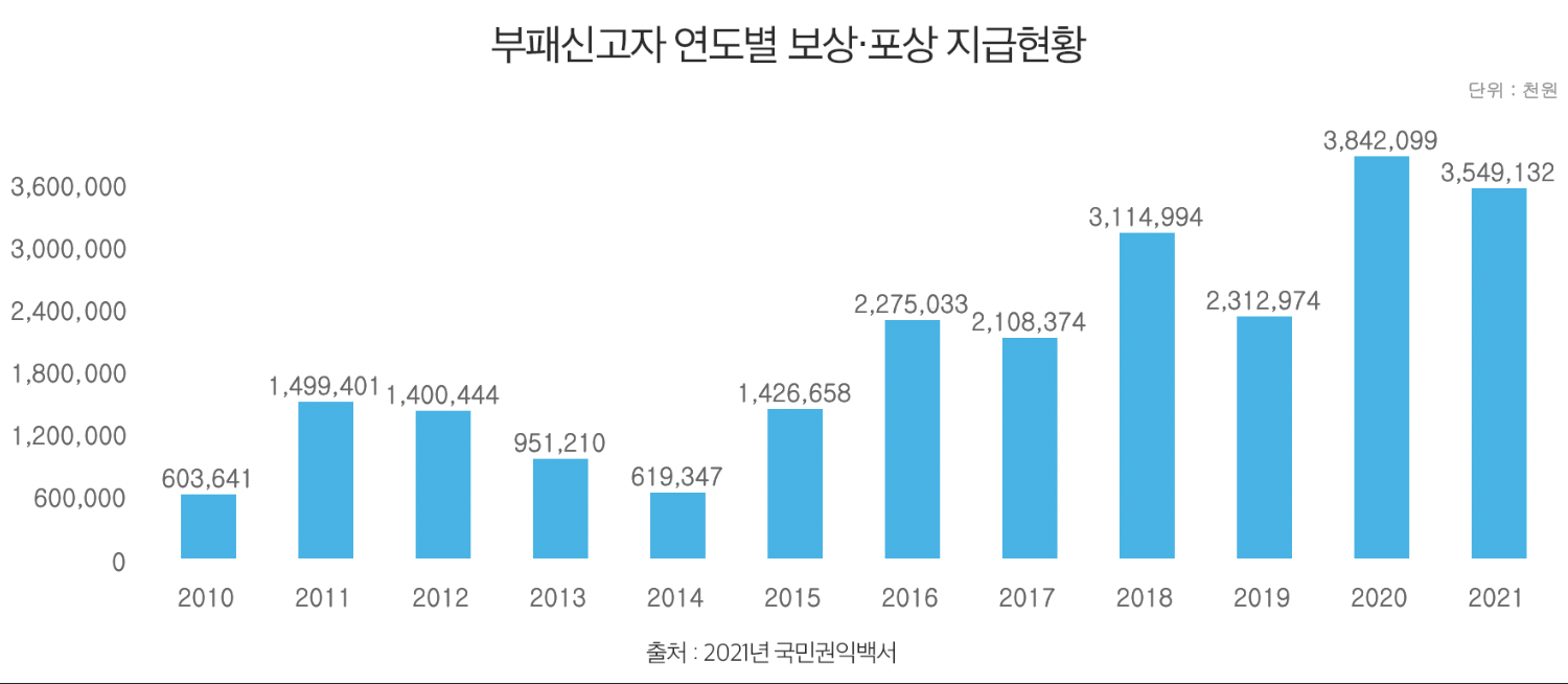 국민권익위원회 신고 건수는 2011년 17건에서 2021년 497건으로 약 30배, 보상금 건수는 12건에서 490건으로 40배 증가했다. 하지만 보상금 액수는 2.3배 증가에 그쳤다.