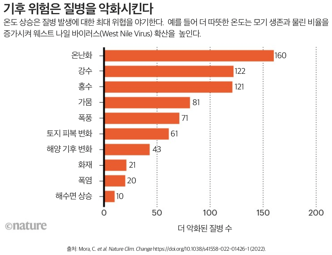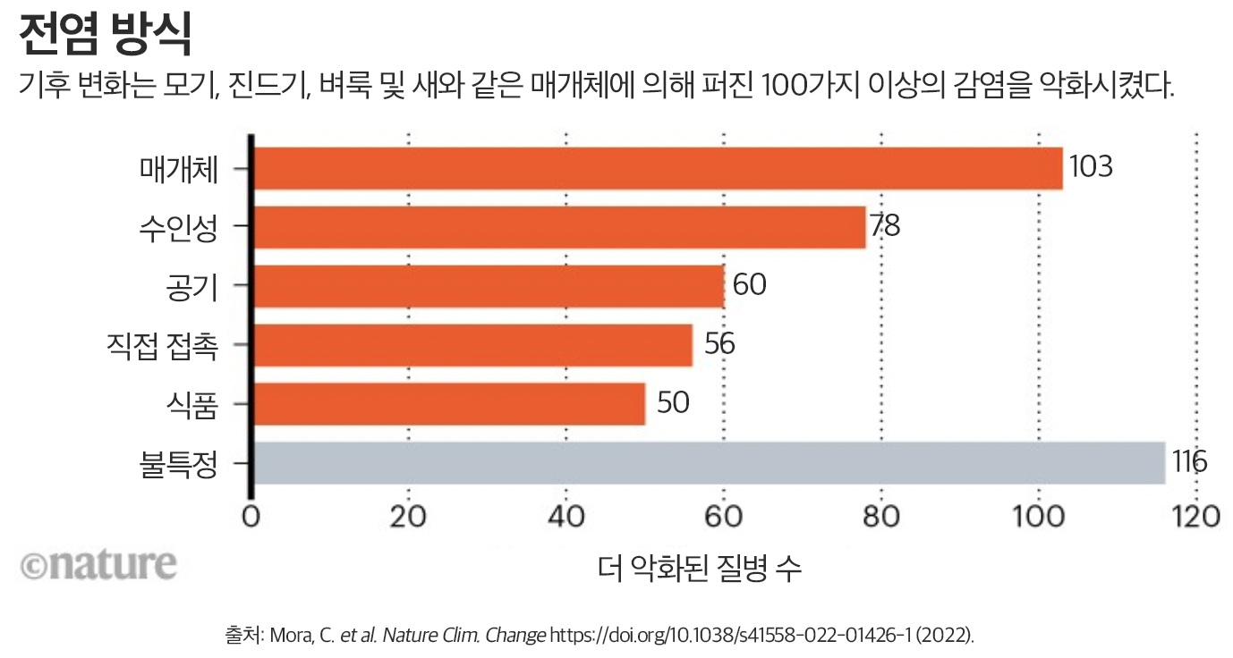 ■ 역자 주: 인간이 야기한 기후 변화로 지구 온난화는 이미 산업화 이전보다 1.1도 높아졌다. 파리 기후 협정에서 합의된 산업화 이전보다 1.5도 미만으로 온난화를 억제하기 위한 의사는 기후 정상회담을 통해 여러 차례 표명되었지만 최근 러시아의 우크라이나 침공 이후 높아진 에너지 위기 속에서 각국은 탄소배출 제로의 길보다는 다시 석유와 석탄 채굴로 눈을 돌리고 있다. 지구 온난화는 북극과 남극의 온난화와 해빙 그리고 해수면 상승, 폭염과 가뭄 그리고 산불, 폭풍과 홍수 등 다양한 연쇄 효과를 불러오고 있다. 이러한 기후 변화는 자연의 극단적 기상이변을 더 이상 극단적이거나 이변이 아닌 일상으로 만들 뿐만 아니라 각종 전염성 및 비전염성 질병도 인간의 일상으로 가져오고 있다. 최근 연구에 따르면 277개의 인간 병원성 질병은 우리의 지속적인 온실가스 배출에 의해 촉발된 광범위한 기후 위험에 의해 악화될 수 있다. 이는 기록된 역사에서 인류에게 영향을 미친 것으로 알려진 모든 전염성 질병의 58%를 포함한다. 코로나19 그리고 최근의 '원숭이 두창'의 출현으로 인한 세계적인 고통은 병원성 질병에 대한 인간의 상당한 취약성을 분명히 드러냈다. 이러한 유형의 질병은 많은 사람들에게 질병과 사망을 유발할 수 있을 뿐만 아니라 더 광범위한 사회경제적 결과를 유발할 수 있다. 예를 들어 코로나19 팬데믹으로 인한 미국의 누적 재정 비용은 2020년 전 세계 총생산의 약 20%에 근접하는 16조 달러에 달한다. 인간 면역결핍 바이러스, 지카, 말라리아, 뎅기열, 치쿤구냐, 인플루엔자, 에볼라, 메르스, 사스와 같은 질병의 부담은 매년 수백만 명의 사망과 설명할 수 없는 엄청난 고통을 초래한다. 이 글은 네이처(Nature)에 게재된 지구 온난화와 질병과의 연관성을 규명하는 논문 요약 기사인 Climate change is making hundreds of diseases much worse의 번역이다. 이 논문은 인간의 온실가스 배출로 야기된 온난화와 질병과의 연관 메커니즘을 규명하고, 어떤 종류의 질병이 더 악화될 수 있는가를 밝히고 있다.