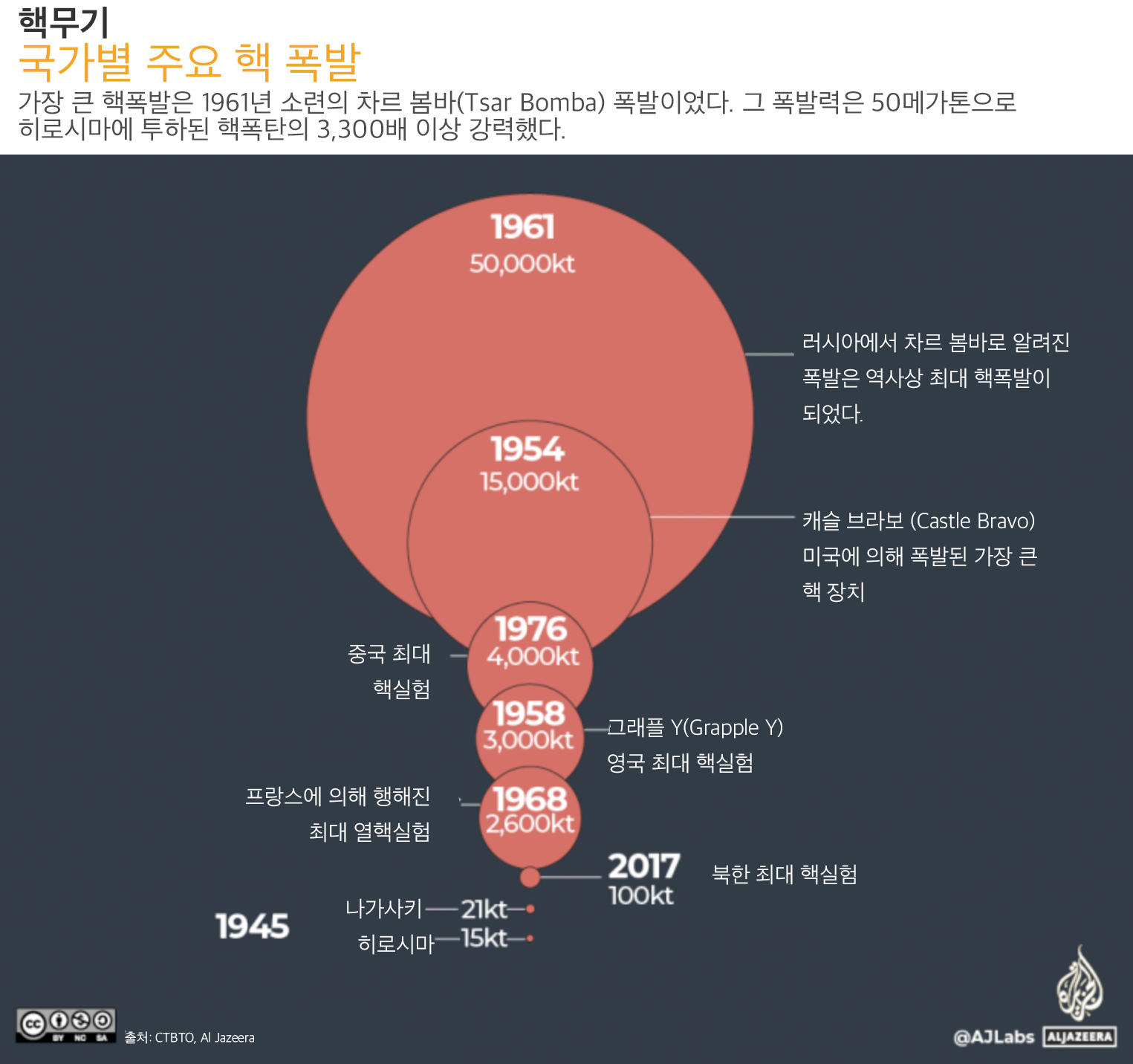 가장 큰 핵폭발은 1961년 소련이 북극권 북쪽의 노바야 젬랴(Novaya Zemlya)에서 차르 봄바(Tsar Bomba)였다. 이 폭발의 핵 출력(yield), 즉 핵폭발 방출되는 에너지 총량은 50메가톤으로 히로시마에 투하된 핵폭탄의 3,300배 이상 강력했다.