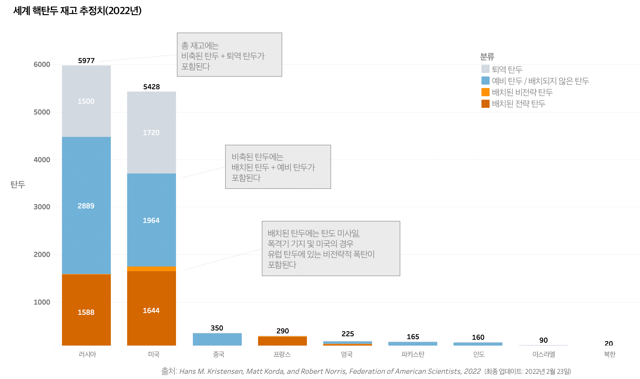 FAS의 핵탄두 추정치는 퇴역 탄두, 예비 탄두, 전략 및 비전략 탄두 등 세분화된 분류를 제공한다.