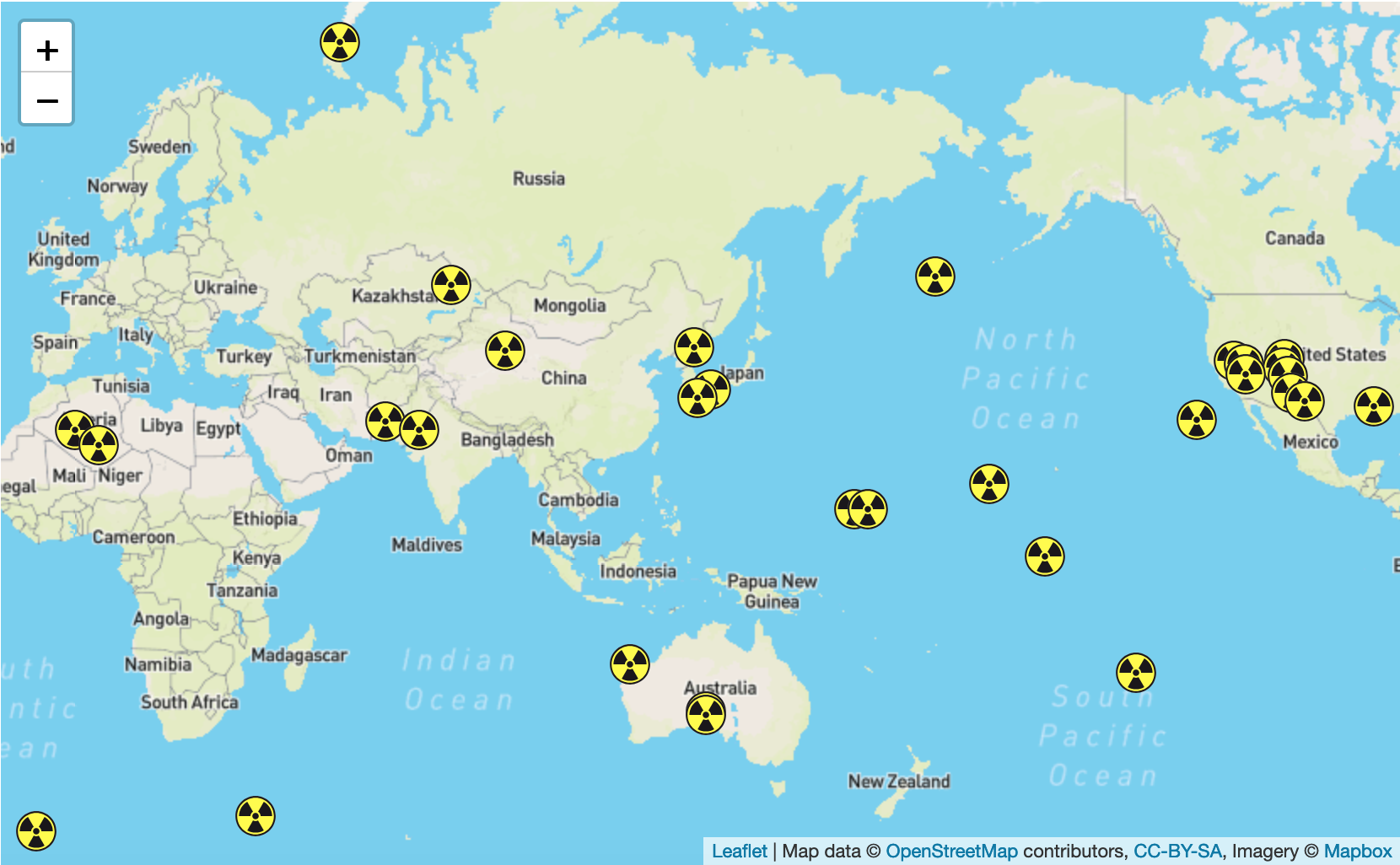 차가이 힐스(Chagai Hills), 파키스탄 발루치스탄(Baluchistan) 1998년 5월 28일 파키스탄 최초의 핵폭발 장소 포카란(Pokharan), 인도 라자스탄 사막(Rajastan Desert) 1974년 5월 18일 인도 최초의 핵폭발 현장. 이 폭탄은 수면 100미터 아래에서 폭발했다. 1998년 5차례의 핵실험이 있었던 곳이다. 몬테벨로 제도(Monte Bello Islands), 오스트레일리아 1952년 영국 최초의 핵무기 실험 장소이다. 1956년까지 대기 테스트에 사용되었다. 나가사키, 일본 전시에 사용된 두 번째 핵무기가 투하된 장소. 나가사키 폭탄인 팻 맨(Fat Man)은 1945년 8월 9일 히로시마에 폭탄을 투하한 지 3일 만에 투하되었다. 그 파괴력은 약 22킬로톤이었다. 히로시마, 일본 전시에 사용된 최초의 핵무기가 투하된 장소. 히로시마 폭탄인 리틀 보이(Little Boy)는 1945년 8월 6일에 투하되었다. 그 파괴력은 약 12킬로톤이었다. 북한 풍계리 핵실험장 북한의 3차 핵실험 장소. 에뮤 필드(Emu Field), 오스트레일리아 두 번의 영국 핵무기 실험 장소 마를링가 및 우메라 시험장(Maralinga and Woomera Test Sites), 오스트레일리아 1950년대에 영국이 대기 테스트를 위해 사용 에니베톡 환초(Eniwetok Atoll), 마샬 제도 미국이 관리하는 이 섬은 1940년대 후반과 50년대에 핵실험에 사용되었다. 에니베톡은 1952년 세계 최초의 열핵폭발 마이크(MIKE)가 있었던 곳이다. 비키니 환초(Bikini Atoll), 마샬 제도 미국이 관리하는 이 섬은 1940년대 후반과 50년대에 핵실험에 사용되었다. 비키니 환초는 브라보(BRAVO) 테스트 장소였다. 존스턴 섬(Johnston Island) 미국이 관리한다. 1950년대 후반과 1960년대 초반의 여러 테스트 장소이다. 태평양 미국의 핵실험 장소 CEP, 무루로아와 팡가타우 환초(Mururoa and Fangatau Atolls), 프랑스령 폴리네시아 (Le Centre d' experimentation du Pacifique, 태평양 실험 센터) 프랑스가 운영하는 CEP는 핵실험에 사용된다. 1968년 8월 24일 프랑스 최초의 열핵 장치가 건설되었다. 크리스마스 섬(Christmas Island), 키리바시 1950년대와 1960년대 초 영국과 미국의 핵실험에 사용되었다. 1957년 5월 15일 영국 최초의 열핵 폭발이 일어난 장소이다. |