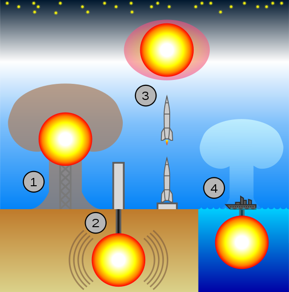 핵무기는 1945년부터 대기, 지하 및 수중의 모든 환경에서 실험되었다. 실험은 바지선, 타워 꼭대기, 풍선, 지구 표면, 수중 600m 이상, 지하 200m 이상에서 수행되었다. 핵실험 폭탄은 항공기에 의해 투하되고 320km 상공까지 로켓에 의해 발사되었다. 핵실험 공간은 크게 대기와 지상으로 나뉘며 세분화하면 대기권 내, 지하, 대기권 외, 수중 실험으로 분류될 수 있다.