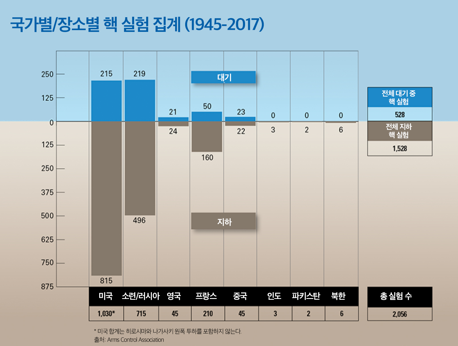 아래 그래프는 1945-2017년 사이 대기와 지상으로 나눈 각 국가별 핵실험 집계이다.