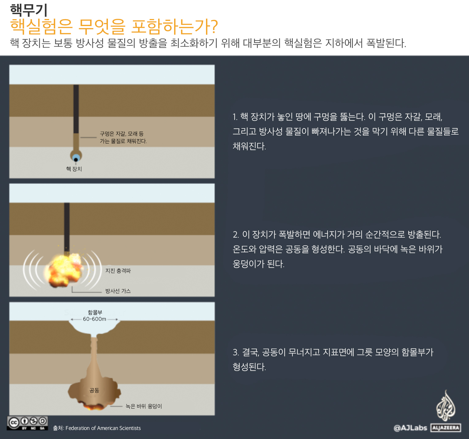 북한은 가장 최근에 핵실험을 한 나라이다. 2017년 풍계리 핵실험장에서 6번째이자 가장 강력한 폭탄이 터졌다. 지하 폭발은 진도 6.3의 진동을 일으켰으며, 히로시마 원폭의 약 7배 핵 출력을 보였다.