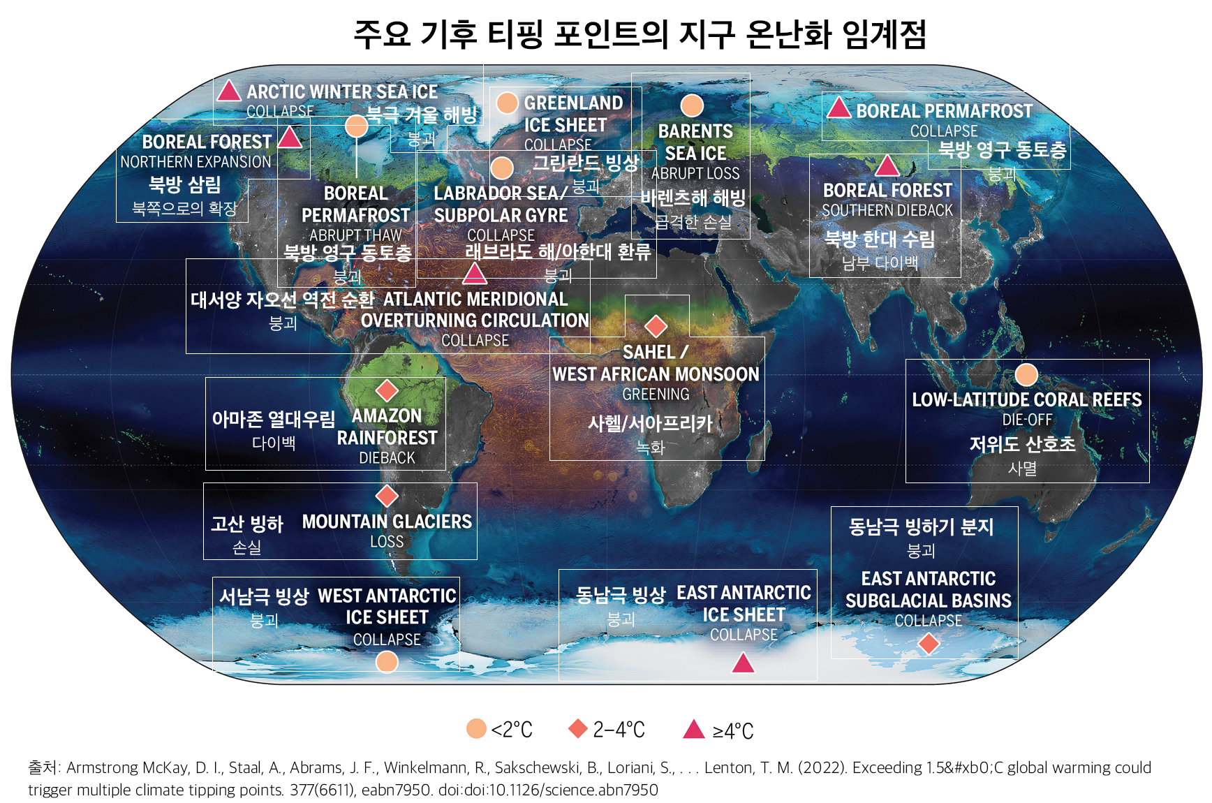 스웨덴 스톡홀름 대학의 데이비드 암스트롱 맥케이(David Armstrong McKay)와 영국 엑서터 대학(University of Exeter)이 이끄는 국제 과학자 팀이 작성한 이 논문은 환경 및 사회적으로 막대한 영향을 미치는 기후 시스템의 주요 변화가 이전에 가정한 것보다 낮은 온도 변화에서 발생할 가능성이 있다는 증거를 제시한다. 이 연구는 인류가 초래한 1.1C의 지구온난화로 인해 지금까지 5개의 위험한 티핑 포인트가 이미 지나갔을 수 있음을 보여준다. 여기에는 그린란드의 만년설이 녹아 결국 해수면이 크게 상승하고, 북대서양의 주요 해류가 붕괴되고, 수십억 명의 사람들이 식량에 의존하는 비를 방해하고, 탄소가 풍부한 영구 동토층이 갑자기 녹는 것이 포함된다. 저자들은 빙상(ice-sheet) 티핑 포인트가 이미 통과되었고 일부 다른 티핑 요소들이 1.1°C에서 1.5°C의 온난화 범위에서 최소 임계치를 가지고 있다는 것을 "배제할 수 없다"라고 말했다.