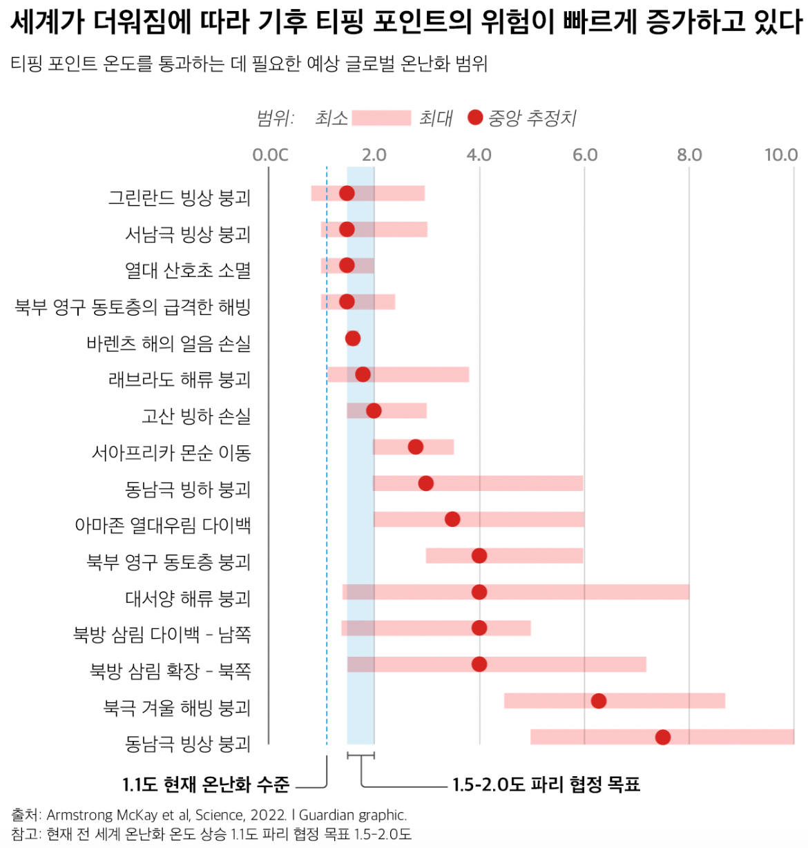 사이언스(Science) 저널의 최근 논문에 따르면 기후 위기로 인해 세계는 여러 심각한 기후 티핑포인트에 직면하게 되었다. 이 논문의 저자들은 과학자들은 세계가 파리 협정 목표를 달성하더라도 빙상 붕괴, 급격한 영구 동토층 해빙 및 산호초 손실이 가능하다고 경고한다. 지금까지 인류가 일으킨 지구 온난화는 산업화 이전에 비해 1.1도 높다. 이는 온난화 수준이 아직 지구 온난화를 산업화 이전에 비해 1.5도 미만으로 제한한다고 규정한 파리협정의 하한선에 미치지 못했다는 것을 의미한다. 하지만 2022년 전 세계가 직면하고 있는 전례 없는 가뭄과 홍수가 닥친 여름은 1.1°C의 지구 온난화 영향을 보여주었다.