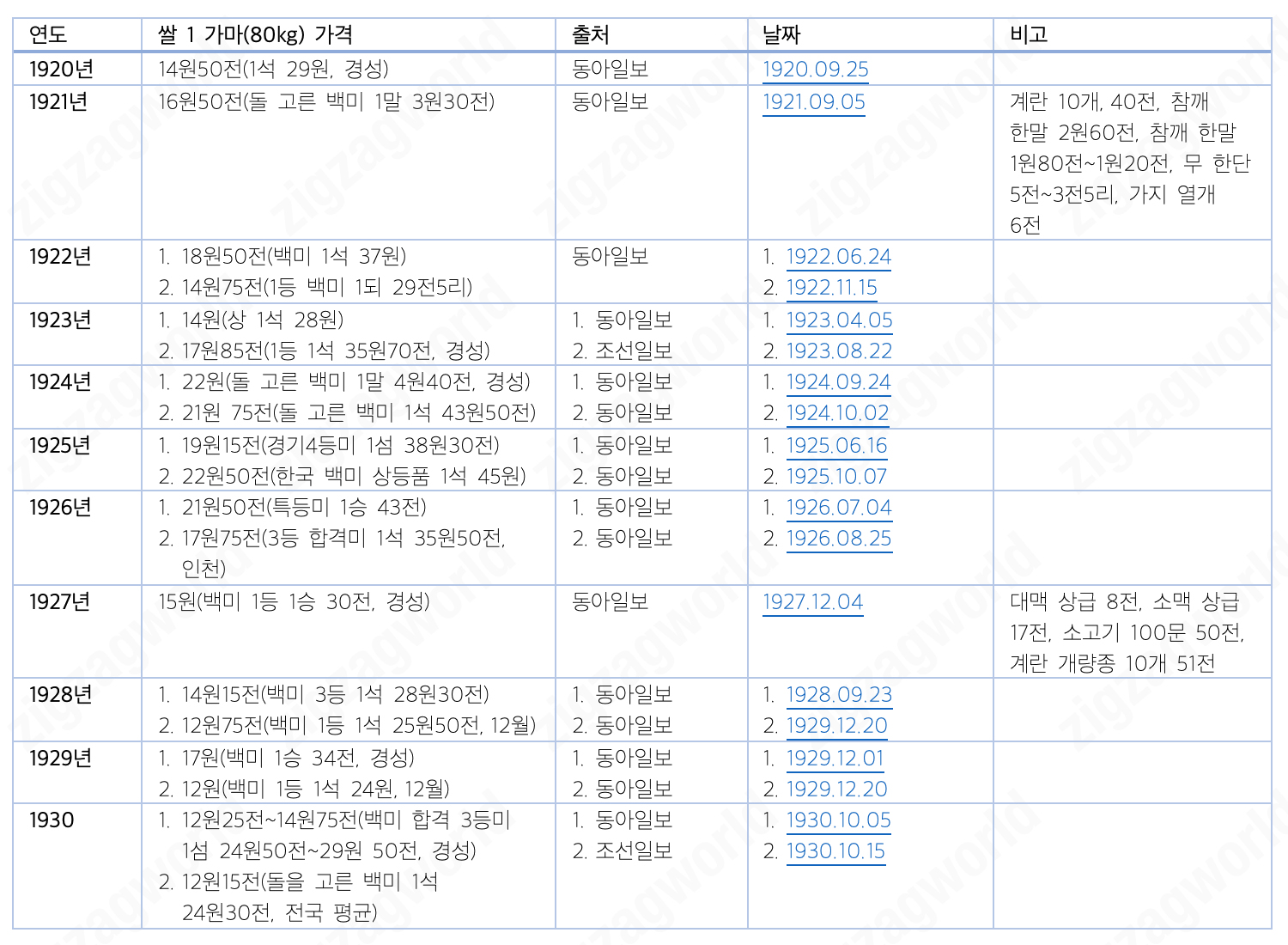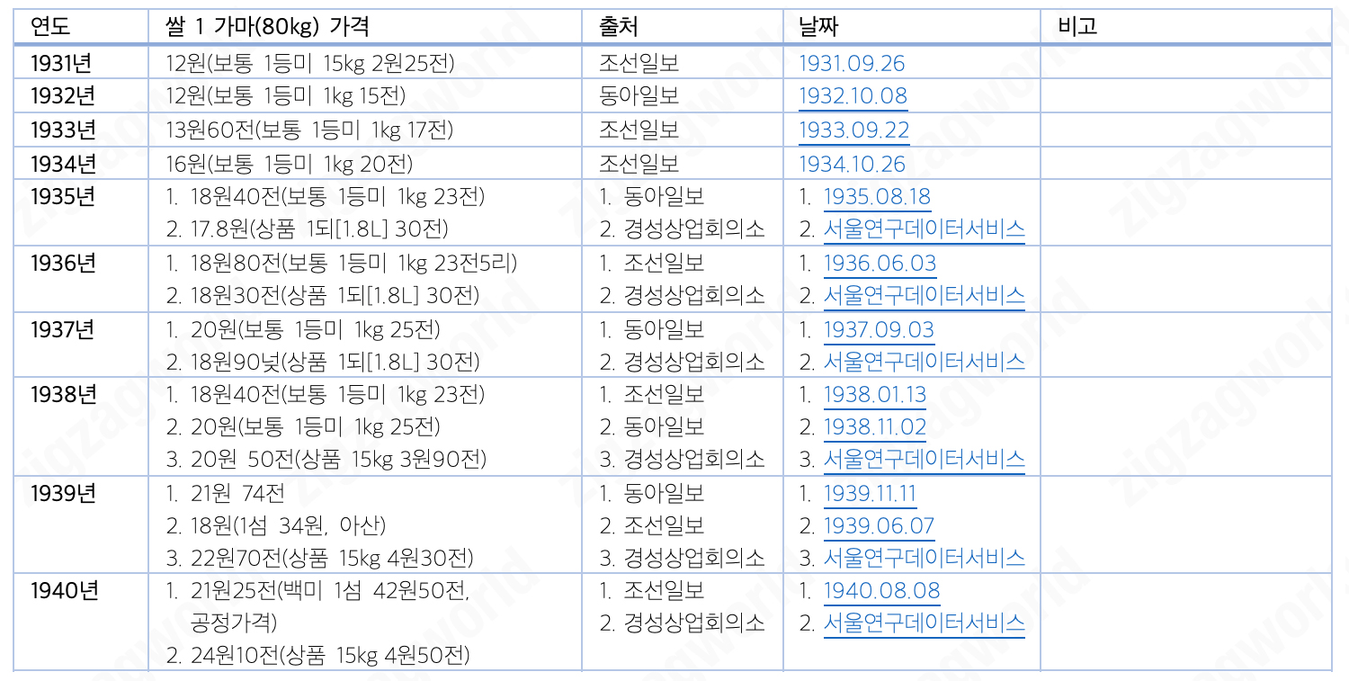 * 각 열의 번호들은 같은 행의 동일한 번호와 같은 소스에서 나온 것들이다. 가령 '쌀 1가마(80kg) 가격' 열의 1번 쌀값, 그 옆 행들의 1번 출처 언론사, 1번 날짜, 1번 비고는 모두 같은 소스의 자료들이다.