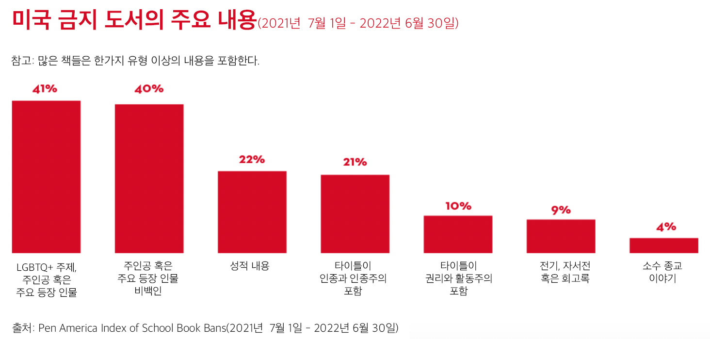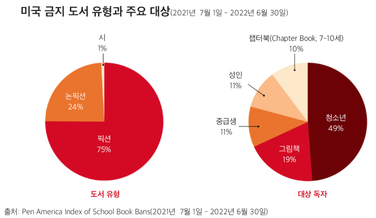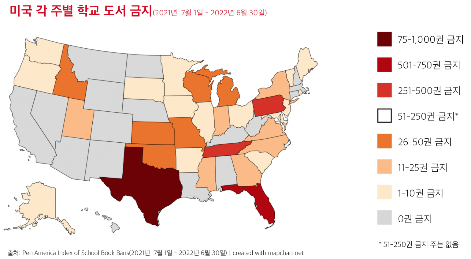 문학 표현의 자유를 지지하는 비영리 단체인 펜 아메리카(Pen America)는 9월에 발표한 보고서 '미국에서 금지됨: 학교에서 책을 검열하려는 움직임이 커지고 있다'(Banned in the USA: The Growing Movement to Censor Books in Schools)는 더 많은 책이 더 많은 학군과 더 많은 주에서 금지되어 더 많은 학생들이 문학에 대한 접근을 상실하고 있다고 밝혔다.