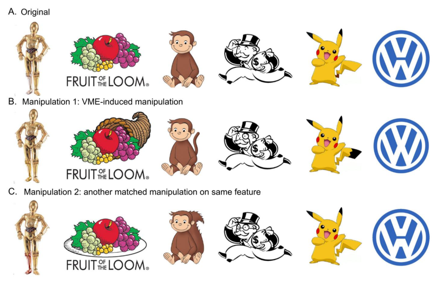 피카추 꼬리 끝에 검은 줄무늬가 없음에도 적지 않은 사람들은 그것이 있다고 믿는다. 보드 게임 모노폴리 맨은 단안경 모노클을 쓰지 않았지만 많은 사람들은 그가 단안경을 썼다고 믿고 심지어는 다른 이들을 설득하려 든다.