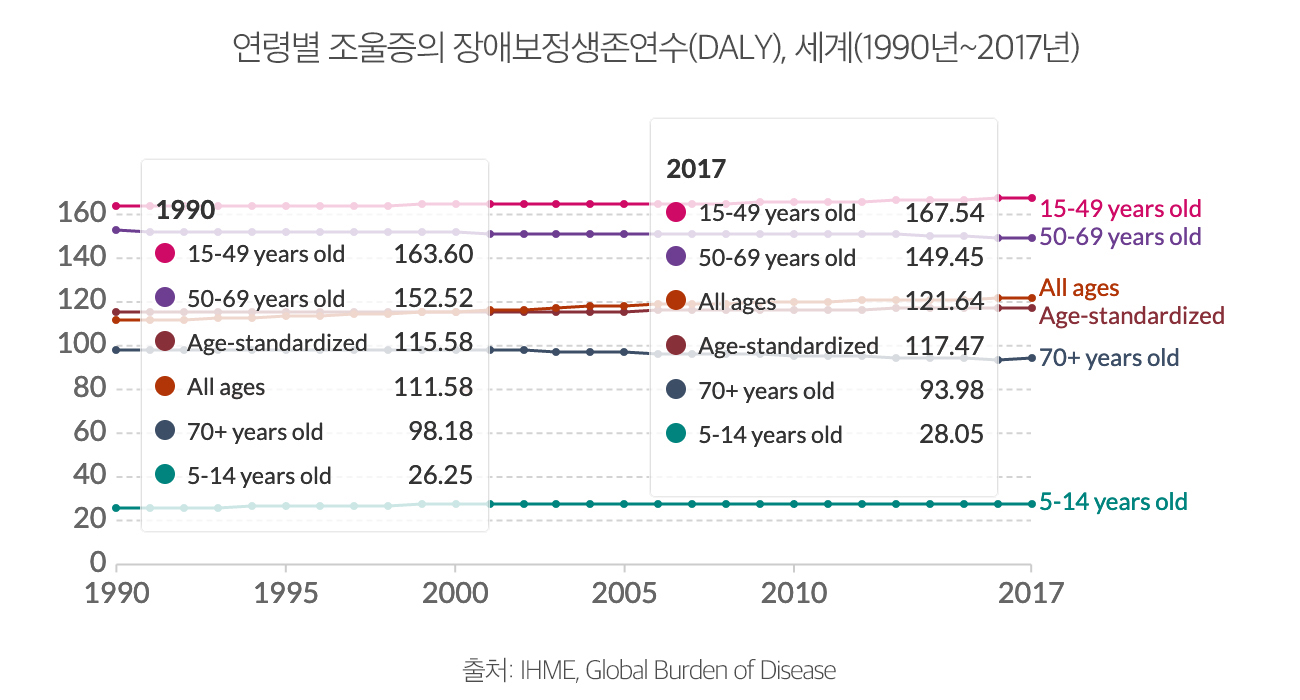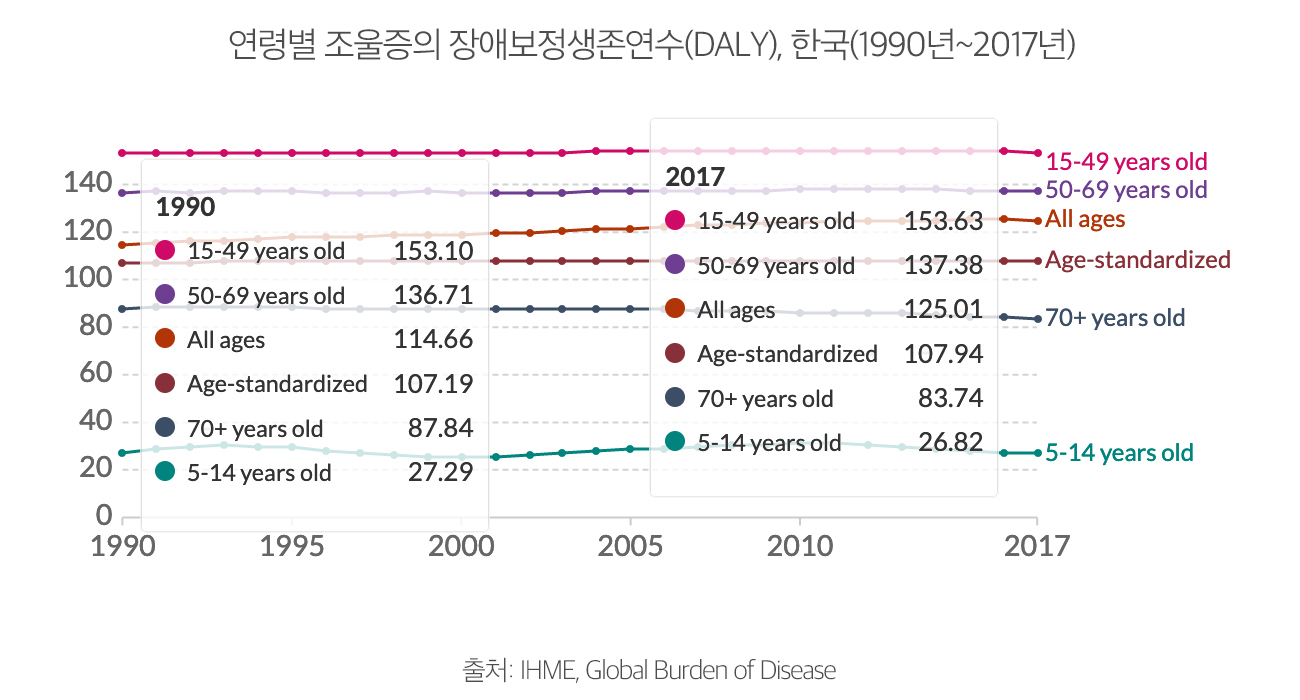 한국의 조울증 장애보정생존연수(DALY)는 1990년 107.19에서 2017년 109.94로 소폭 상승했지만, 세계의 117.47보다는 낮은 편이다. 연령별 조울증 DALY는 70세 이상 연령층의 DALY가 같은 기간 87.84에서 83.74로 눈에 띄게 감소했다.