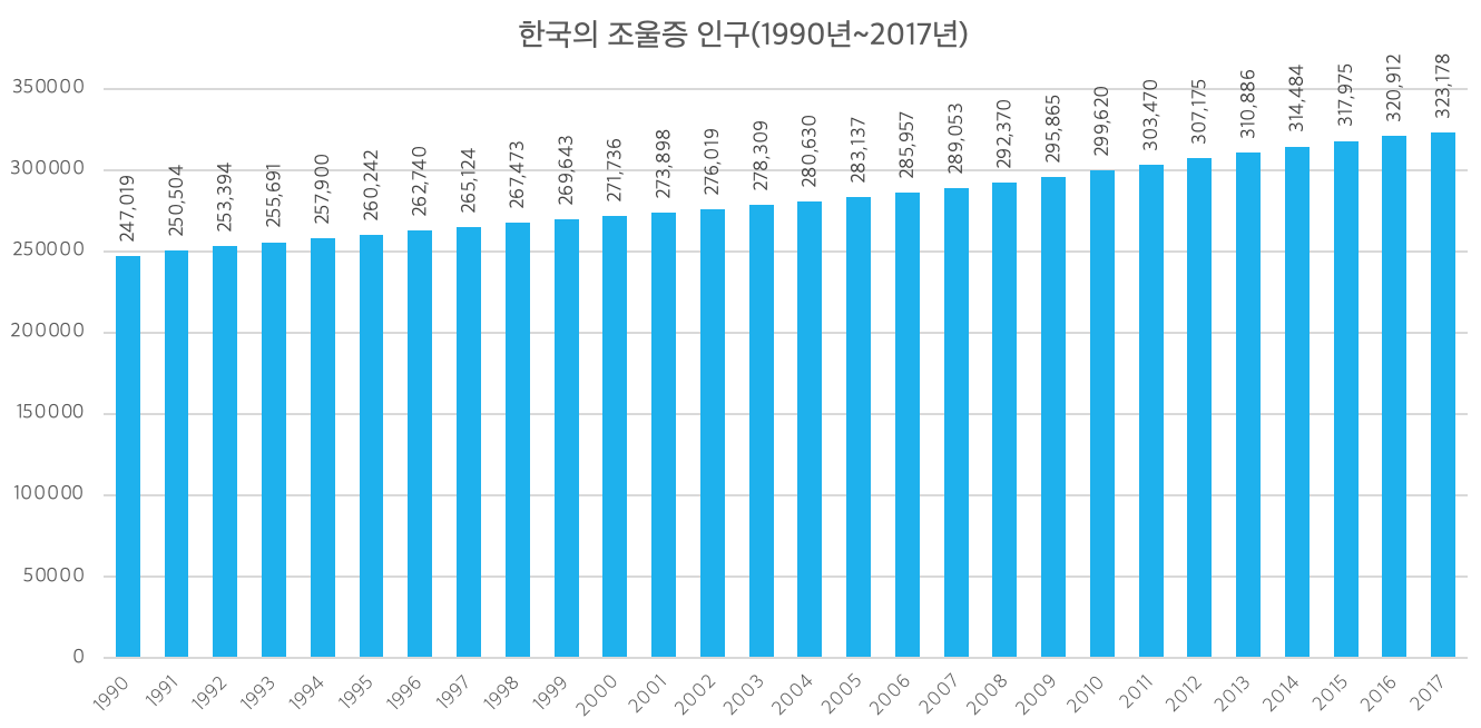 한국의 조울증 인구는 1990년 여성 12만7천 명, 남성 11만9천 명에서 2017년 각각 16만9천 명과 15만4천 명으로 증가했다. 같은 기간 여성의 비율은 51.49%에서 52.3%로 증가했고, 남성은 48.51%에서 47.7%로 감소했다.