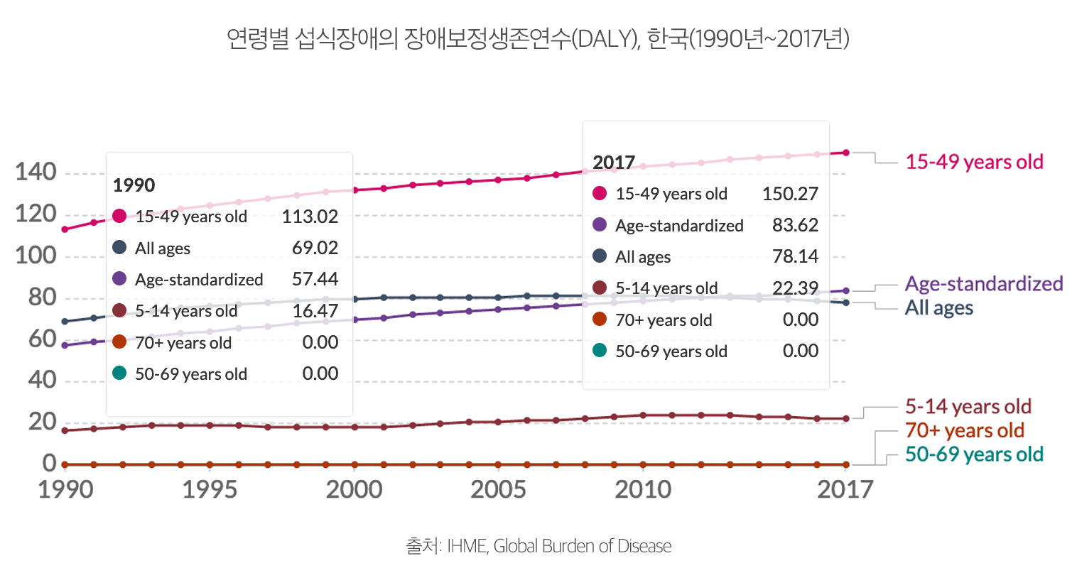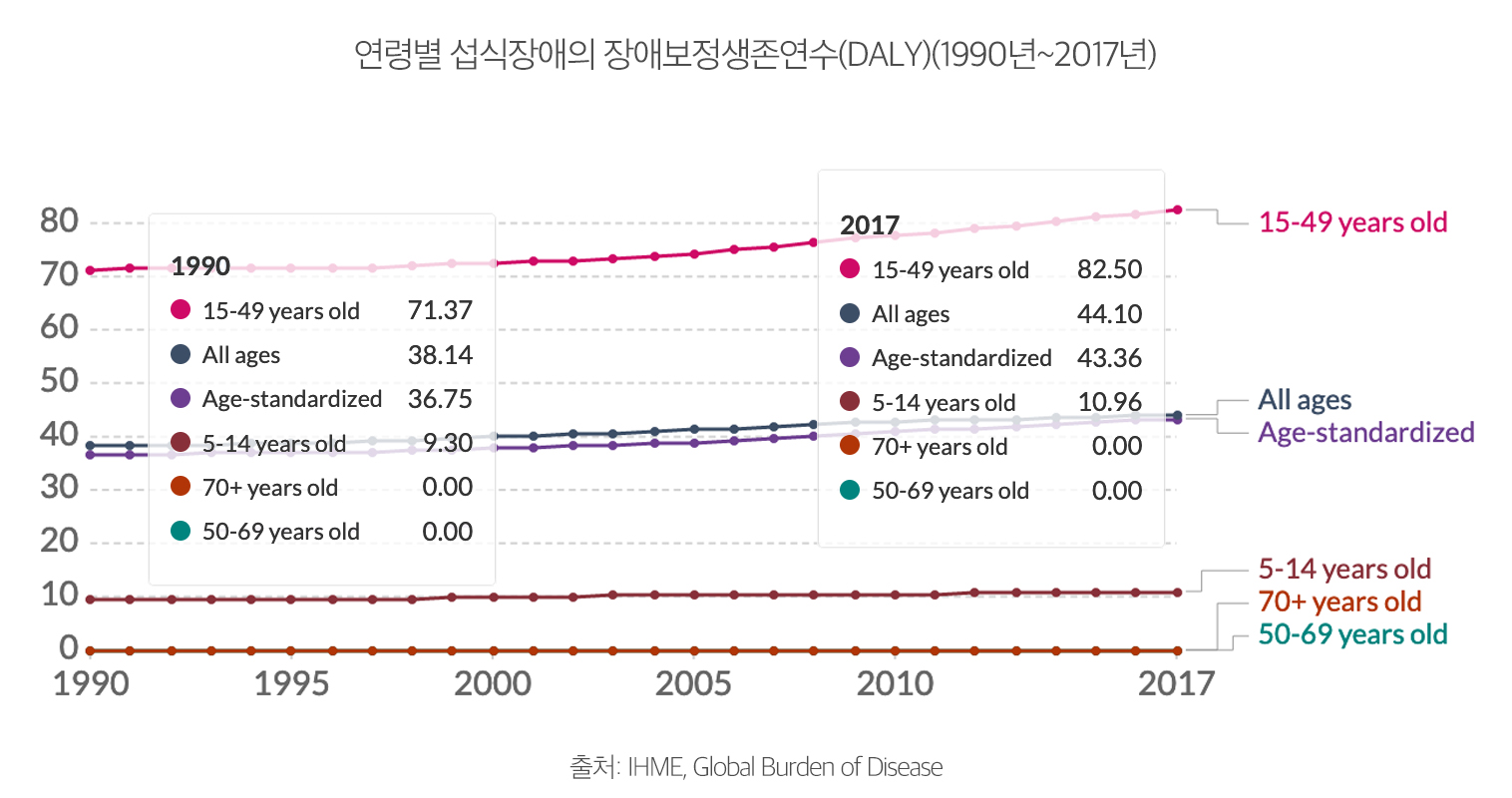 한국 섭식장애의 장애보정생존연수는 1990년 57.44에서 2017년 83.62로 약 46% 상승했다. 이는 세계적으로 10번째로 높은 상승률이며, 세계 장애보정생존연 43.36의 약 두 배에 해당한다. 절대 변화상으로는 크지 않지만 5세~14세 연령층의 섭식장애로 인한 DALY 상승률은 약 36%로 세계에서 14번째로 높은 상승률이다.