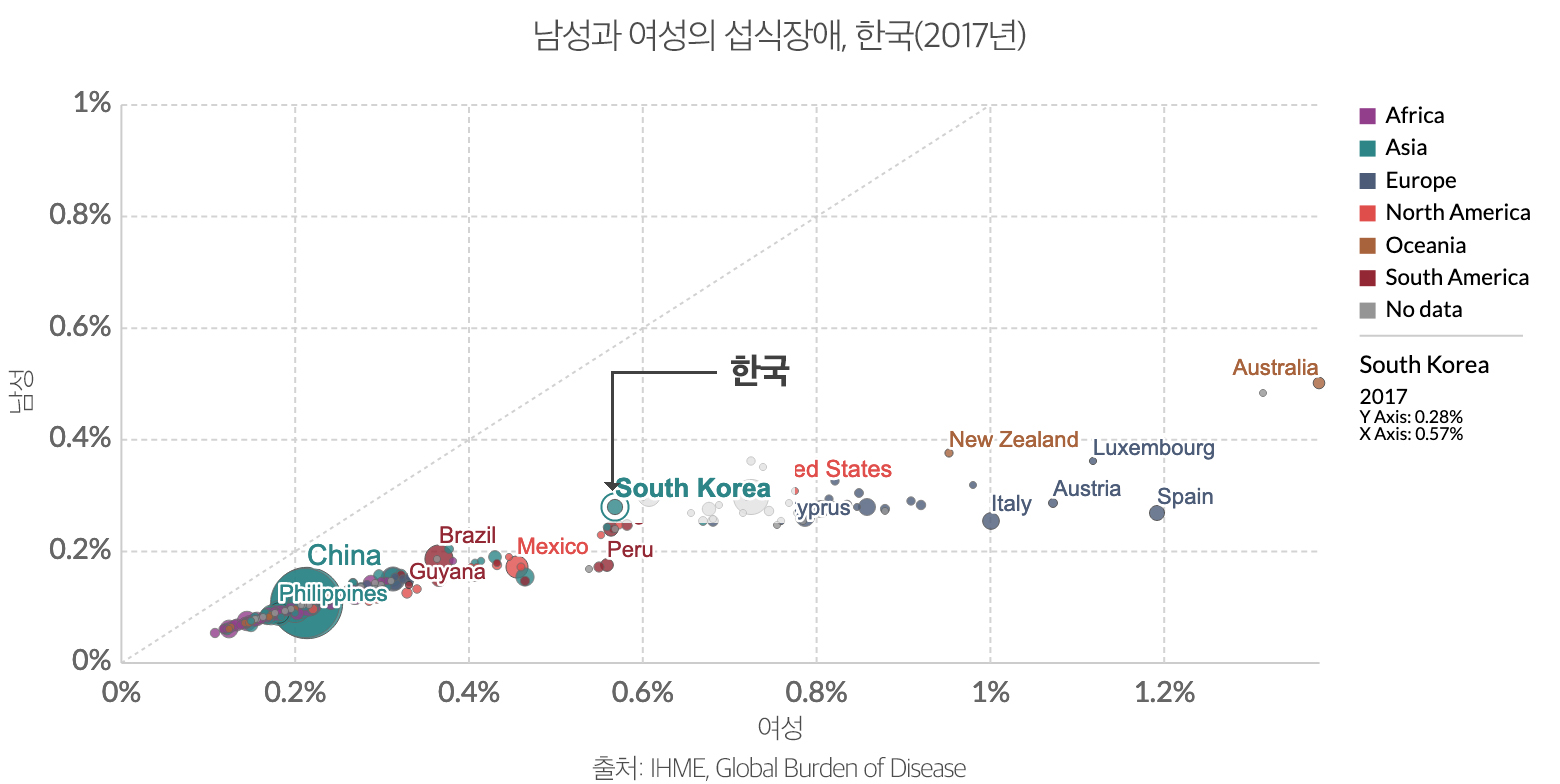 아래의 산점도는 세계 섭식장애 인구의 성별 비율을 보여준다. Y축이 남성, X축이 여성이며, 가운데 점선을 기준으로 모든 점이 X축에 산포해 있다. 즉, 여성들의 섭식장애 비율이 남성에 비해 높다는 것이다. 세계 평균을 보면 남성의 0.13%가 섭식장애 인구인 데 반해, 여성의 섭식장애 인구는 그 두 배가 넘는 0.29%이다. 오스트레일리아 경우는 남성 인구의 0.5%가 섭식장애로 그 자체만으로도 세계에서 가장 높은 남성 섭식장애율을 가지고 있지만, 여성 섭식장애 비율 1.38%에 비하면 거의 두 배 이상 낮은 셈이다. 스페인은 여성 섭식장애 인구가 전체 여성의 1.19%로 남성 섭식장애 인구가 전체 남성 인구에서 차지하는 비율 0.27%의 4배를 넘는다.