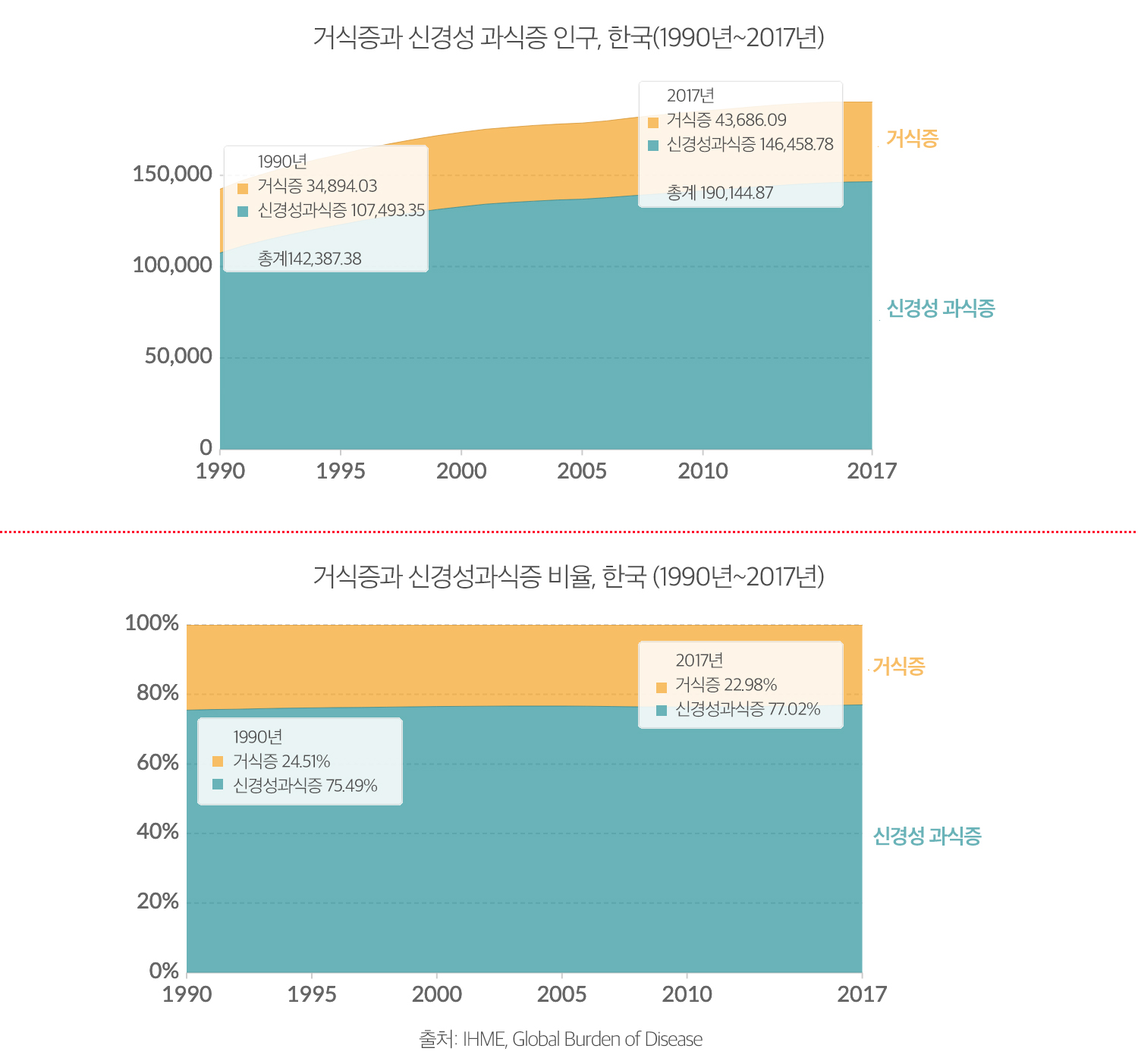 한국의 거식증 인구는 1990년 3만4천 명에서 2017년 4만3천 명으로 25% 증가했으며, 신경성 과식증 인구는 10만7천 명에서 14만4천 명으로 36% 증가했다. 한국의 거식증과 신경성 과식증 인구 비율은 22.98%와 77.02%로 세계적 상황과 마찬가지로 후자의 비율이 전자의 3배를 넘는다.
