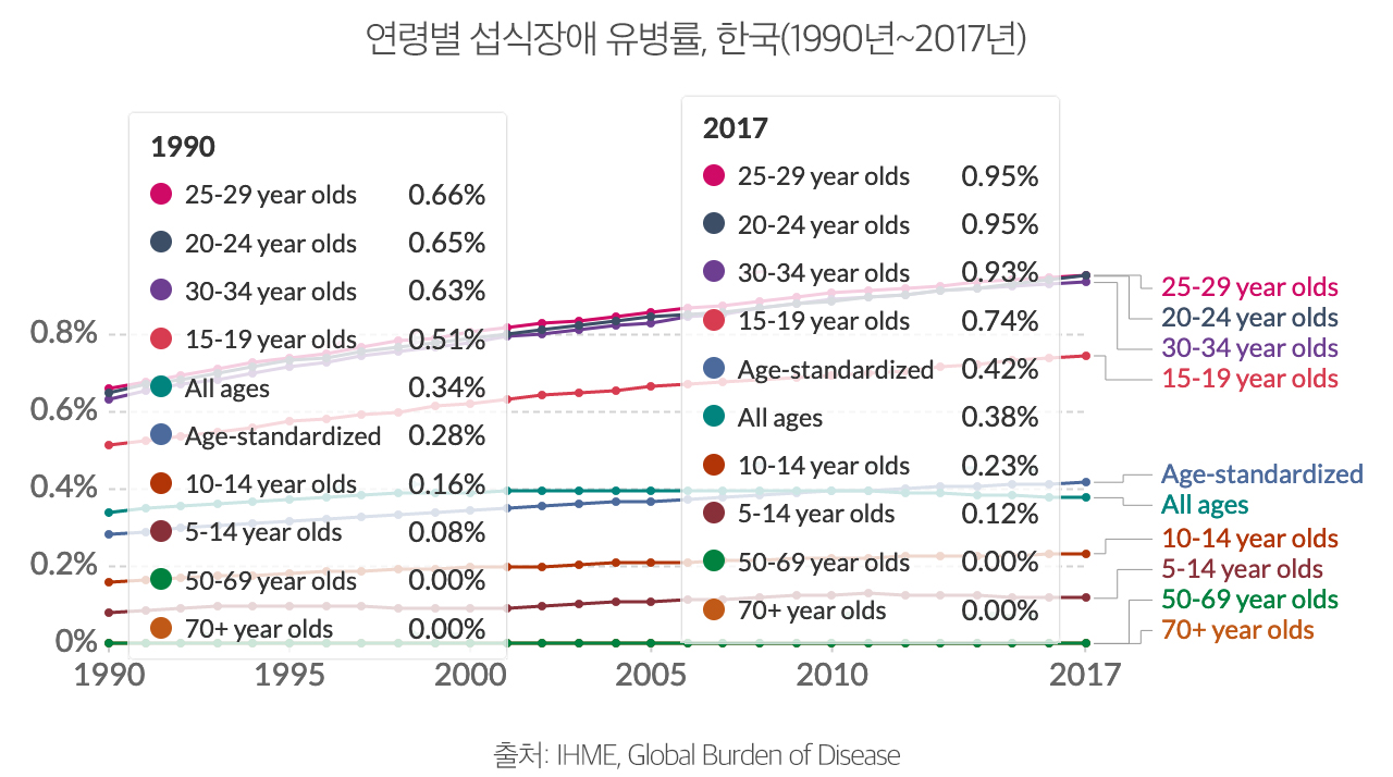 연령표준화로 보면 한국의 섭식장애 비율은 1990년 0.28%에서 0.42%로 증가했다. 섭식장애가 없는 50세~70세 이상 연령층을 제외하면 모든 연령층에서 섭식장애가 적게는 0.23%에서 많게는 0.3% 증가했다. 아래 차트를 보면 15세~34세 연령층의 섭식장애 증가가 비교적 가파른 것을 볼 수 있다.