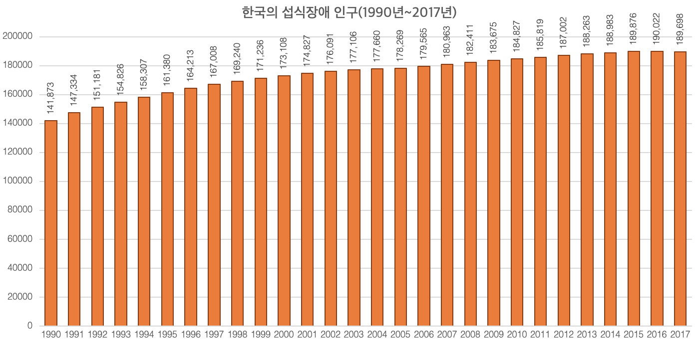 한국의 섭식장애 인구는 1990년 14만8천 명에서 2017년 18만6천 명으로 약 34% 증가했다. 전체 인구에서 보면 같은 기간 전체 인구의 0.28%에서 0.42%로 약 48% 증가했다. 이 증가율은 세계에서 9번째로 높은 증가율이다.