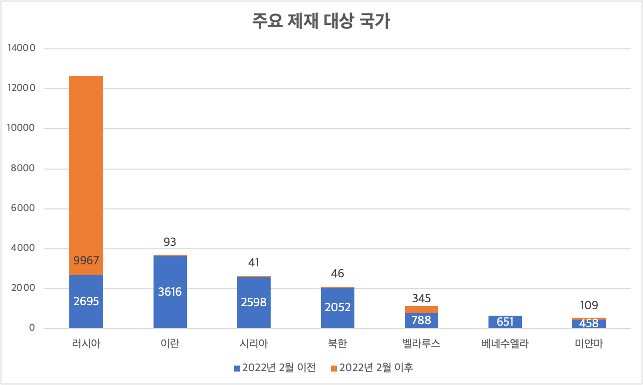 현재 전 세계 주요 제재 대 주요 국가는 러시아, 이란, 시리아, 북한, 벨라루스 순이다. 러시아에 대한 제재는 12,662 건으로 압도적 1위이며, 대부분이 러시아의 우크라이나 침공 이후 이루어졌다. 이란에 대한 제재는 현재 3,706 건, 시리아는 2,639 건, 북한은 2,098 건, 벨라루스는 1,133 건이다. 대 이란 제재는 주로 이란의 핵 프로그램과 테러 지원과 관련이 있으며, 대 북한 제재는 미시일 발사와 핵실험과 관련된 제재로 2006년 이후 지속적으로 확대되어왔다.