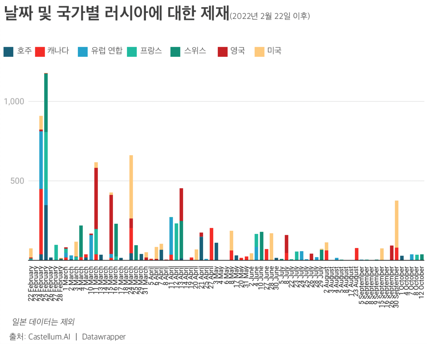 아래 도표는 러시아에 가스와 석유 등 주요 에너지원을 의존하고 있기에 러시아 제재에는 소극적이었던 유럽 국가들일 러시아의 우크라이나 침공 이후 얼마나 적극적으로 제재에 참여하고 있는가를 보여준다. 2월 24일 러시아의 우크라이나 침공 이후 유럽연합과 프랑스, 스위스와 영국 등의 유럽 국가들은 러시아에 대한 제재 범위와 수위를 강화해왔다.