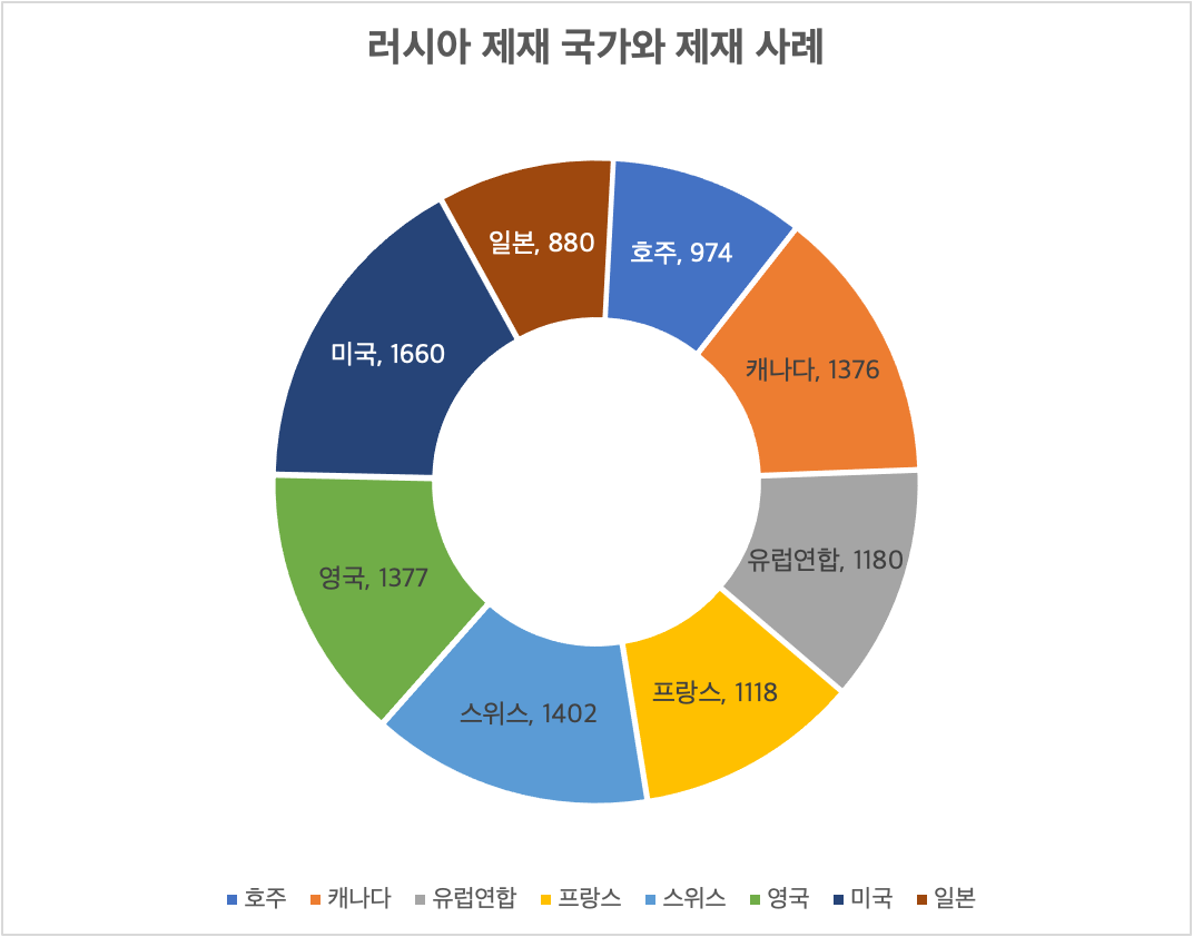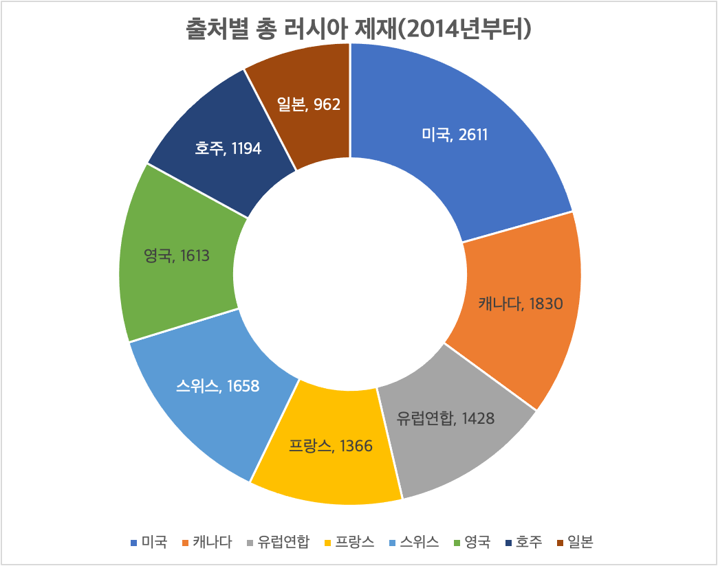 러시아가 우크라이나와 러시아 접경 지역인 루한스크와 도네츠크에 친러 집단의 독립을 지원한 2014년 이후부터 러시아 제재를 살펴보면 미국이 압도적으로 많음을 알 수 있다. 위의 '러시아 제재 국가와 제재 사례'를 감안하면 유럽 국가들의 러시아 제재의 대부분은 확실히 러시아의 우크라이나 침공 이후에 이루어진 것이다. 이는 유럽과 직접 맞닿은 우크라이나가 침공당하면서 유럽의 안보위기가 기존의 루한스크와 도네츠크 때와 달리 매우 직접적이고 심각해졌음을 반영하고 있다.