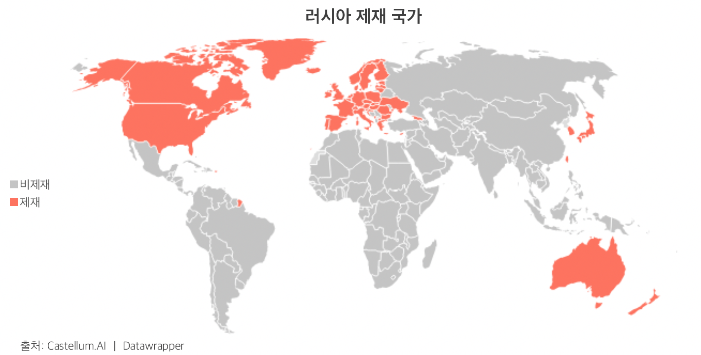 세계의 각종 제재와 관련된 데이터베이스를 제공하는 웹사이트 카스텔룸(Castellum.ai)에 따르면 러시아는 2월 22일까지 2,754건의 제재를 받아 이란에 이어 세계에서 두 번째로 제재를 많이 받는 국가였다. 그러나 블라디미르 푸틴(Vladimir Putin) 대통령이 2월 21일 우크라이나 동부로 군대를 이동시킨 1주일 뒤 러시아에 대한 제재는 4,908건으로 치솟았다. 2월 22일 이후 10월 중순까지 러시아에 대한 추가 제재는 약 1만 건 가까이 증가했다. 카스텔룸을 공동 설립한 오바마와 트럼프 행정부의 전 재무부 관료인 피터 피아테츠키(Peter Piatetsky)는 "이것은 금융 핵전쟁이자 역사상 가장 큰 제재 사건"이라고 말했다. "러시아는 2주도 채 되지 않아 세계 경제의 일부에서 세계 제재의 단일 최대 목표이자 금융 왕따가 되었습니다."라고 말했다.