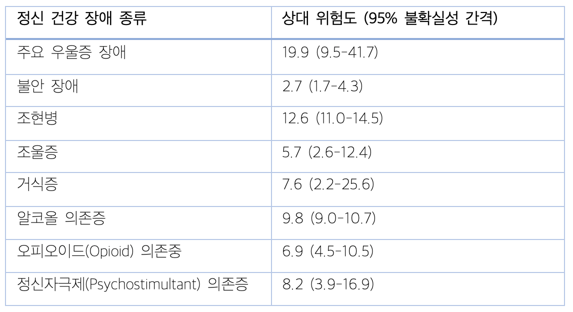 표의 수치는 다음 질환 중 하나를 가진 개인의 자살 위험 증가의 추정치를 표시한다. 예를 들어 우울증을 앓고 있는 사람은 그렇지 않은 사람보다 자살로 사망할 확률이 20 배 더 높으며, 불안장애는 2.7배, 조현병은 12.6배, 조울증은 5.7배, 거식증은 7.6배, 알코올 의존증은 9.8배, 오피오이드 의존증은 6.9배, 정신자극제 의존증은 8.2배 더 높다.