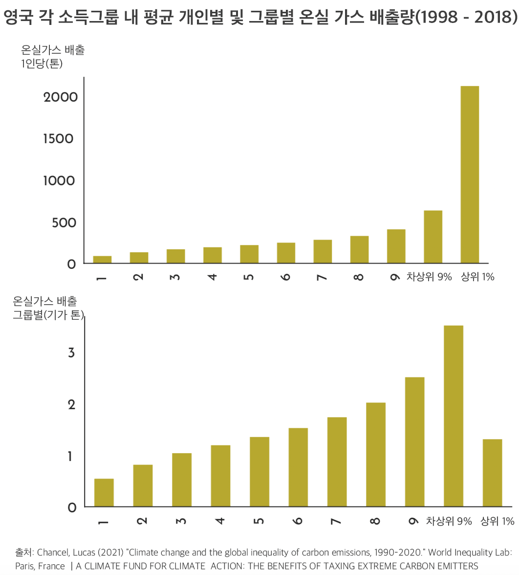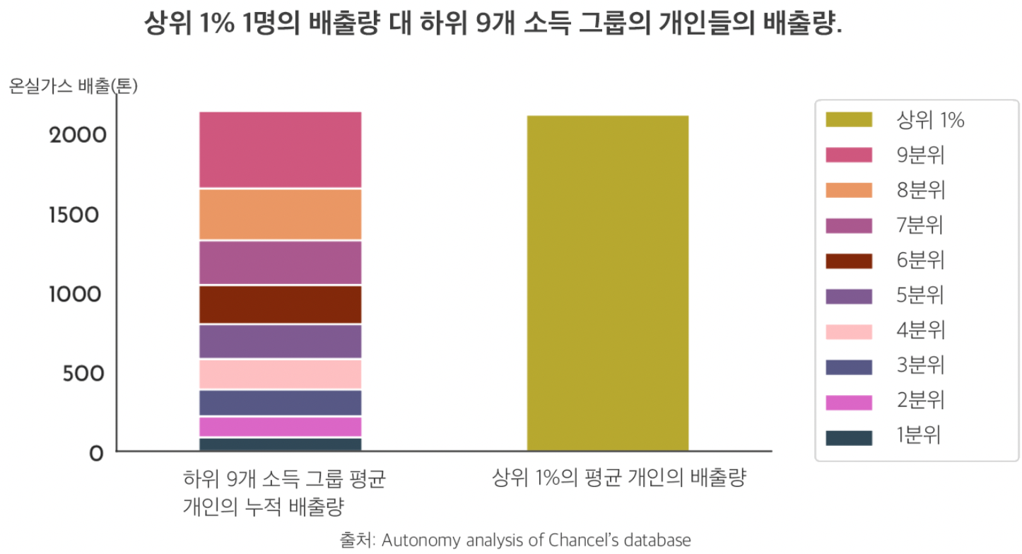 아래 막대 차트 왼쪽에는 처음 9개 소득 십분위수에 속하는 9명의 다른 개인의 누적 배출량이 표시된다. 오른쪽에는 상위 1%에 속하는 개인의 누적 배출량을 표시된다. 상위 1% 개인의 배출량은 나머지 하위 90%를 구성하는 10 분위에서 9명의 총 배출량과 대략 일치한다.