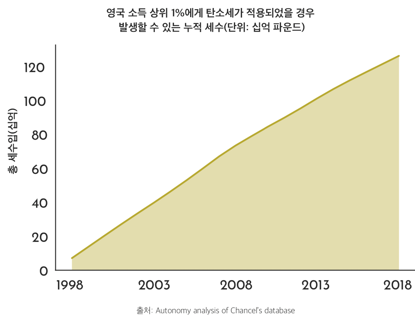 아래 박스에서 보듯이 만약 영국 정부가 상위 1%에 대한 탄소세를 부과했었다면 영국의 에너지원과 전력망을 화석에너지에서 재생가능 에너지로 전환하고 경제를 녹색화 할 수도 있었다고 오토노미는 분석한다. 이 기금은 현재 2030년으로 설정된 영국의 배출 순제로 목표에 대한 가속화된 투자를 사용하여 탈탄소 및 안전한 전기 시스템을 보장했을 것이다. 이 투자는 추가적인 태양열, 풍력 및 조력 발전을 통해 영국 국가 전력망의 잠재 용량을 89GW까지 증가시킬 수 있었을 뿐만 아니라 개선된 하이드로 펌프 저장도 가능했었을 것이라고 추정한다. 그것은 또한 영국의 석유와 석탄 의존도를 0으로 줄이고 가스 의존도를 50% 줄였을 것이다. 재생 가능 에너지의 운영 비용이 비재생 가능 자원보다 훨씬 낮다는 점을 감안할 때 2030년 11월까지 900억 파운드의 절감 효과도 거둘 수 있었다.