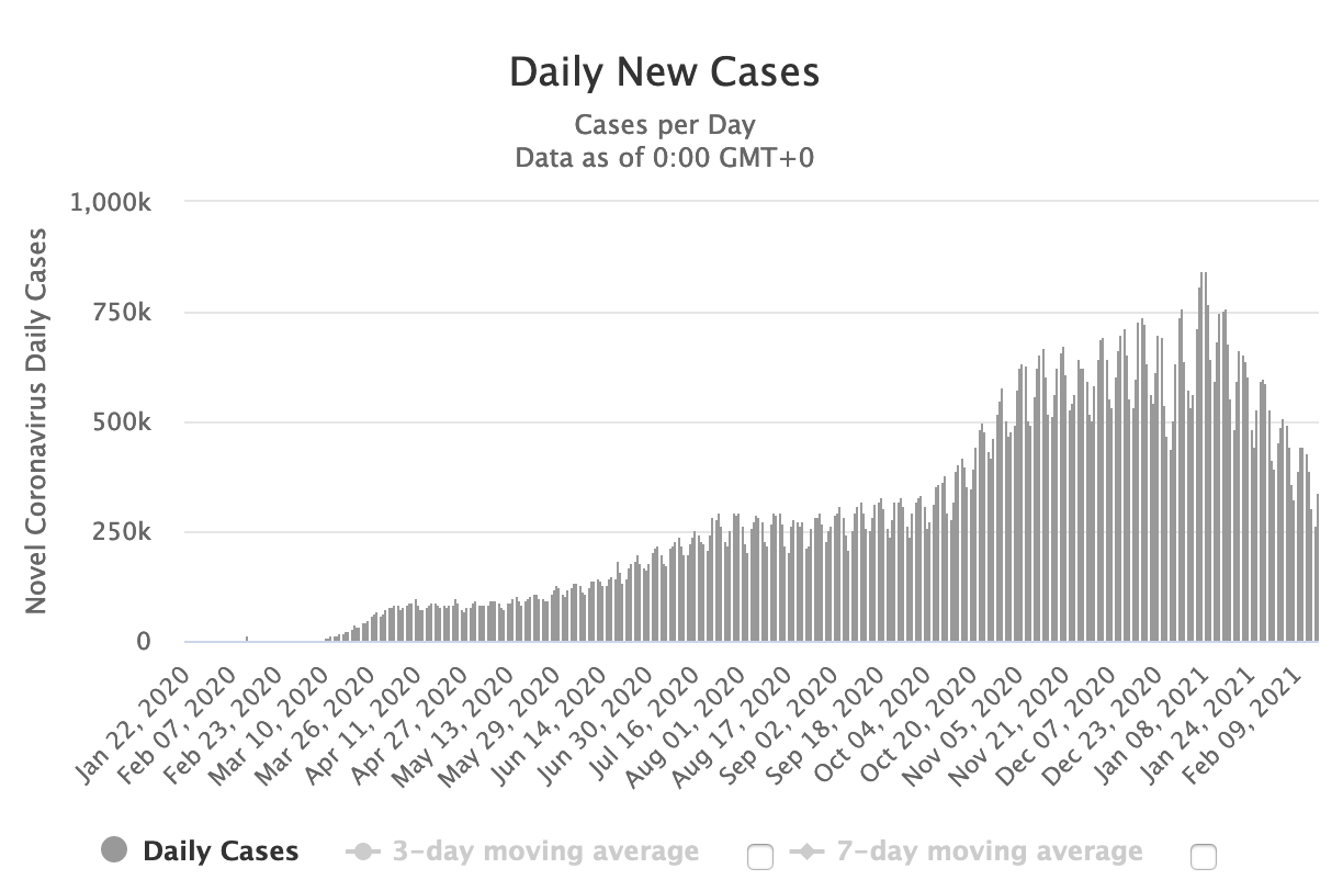 세계보건기구(WHO)는 2월 17일 현재 주간 역학 보고서에서 전 세계적으로 보고된 새로운 코로나 19 환자 수가 지난주 16% 감소한 270만 명에 이른다고 밝혔다.