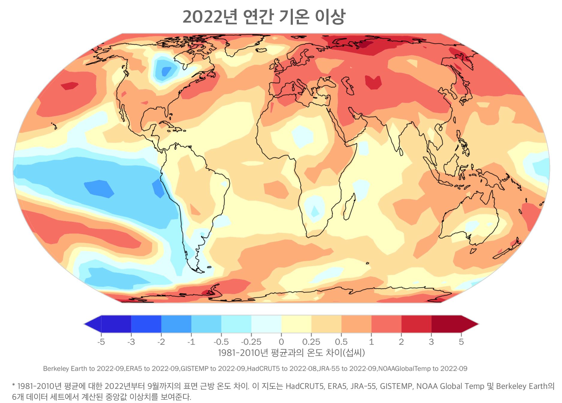 2022년 지구 평균 기온은 현재 1850-1900년 산업화 이전 평균보다 섭씨 1.15도[1.02~1.28도] 정도 높은 것으로 추정된다. 드물게 3중 냉각 라니냐(triple-dip cooling La Niña)*는 2022년이 "단지" 5~6번째로 따뜻할 것이라는 것을 의미한다. 하지만, 이것은 장기적인 추세를 역전시키는 것은 아니다. 기록상 또 다른 가장 더운 해가 오는 것은 단지 시간문제일 뿐이다.