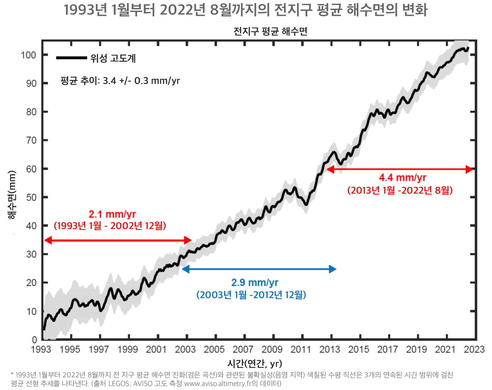 지구 평균 해수면은 위성 고도계 기록의 30년(1993-2022년) 동안 매년 3.4 ± 0.3 mm씩 상승했다. 이 비율은 1993-2002년과 2013-2022년 사이에 두 배로 증가했고 2021년 1월~2022년 8월 사이에 해수면이 약 5mm 증가했다. 이 가속도는 얼음 녹는 양이 늘어났기 때문이다.