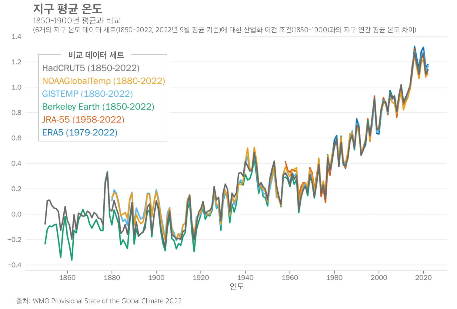 WMO는 HadCRUT.5.0.1.0(UK Met Office), NOAAglobal Temp v5(미국), NASA GISTEMP v4(미국), 버클리 어스(미국), ERA5(ECMWF), JRA-55(일본) 등의 온도에 대한 6개의 국제 데이터 세트를 사용한다.