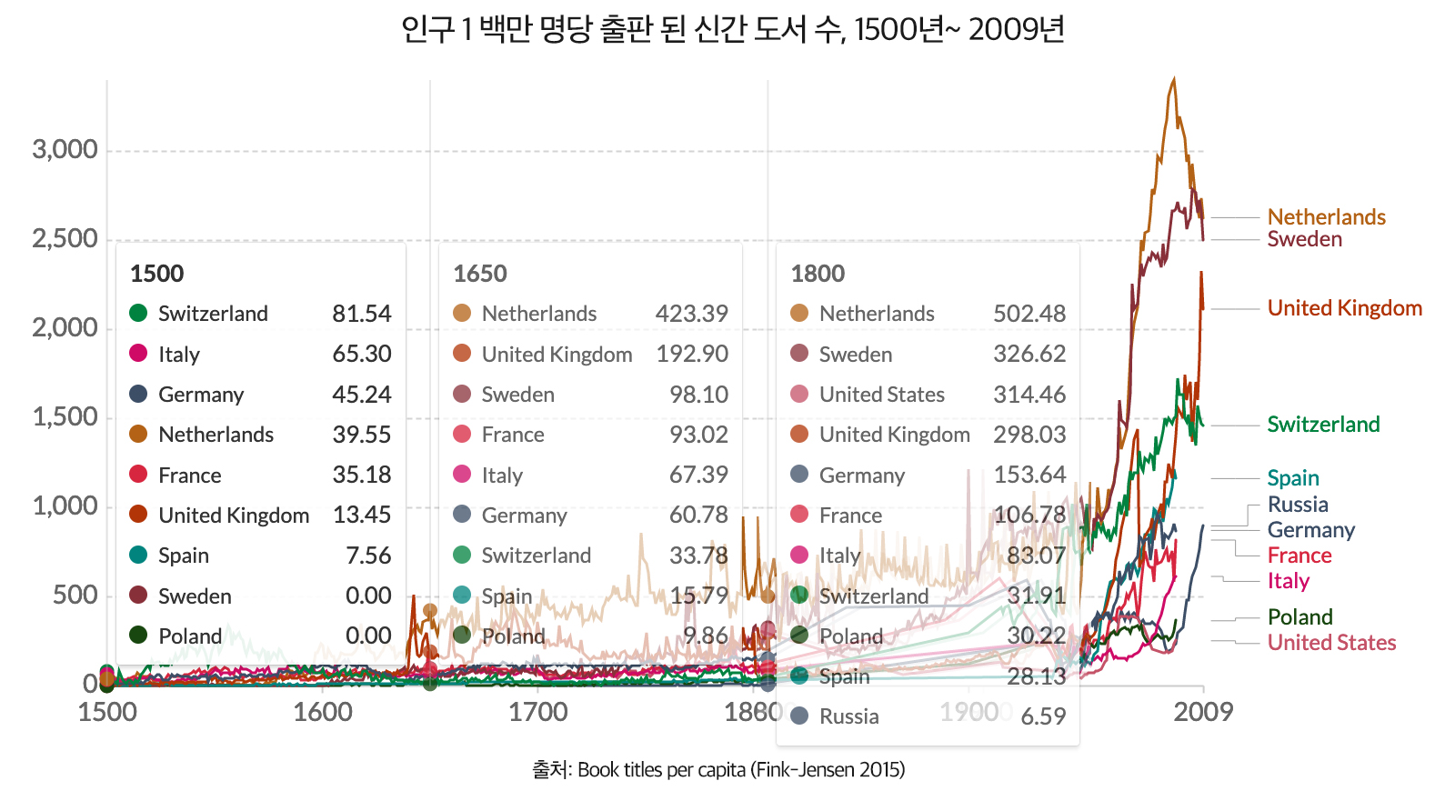인구 1백만 명당 출판된 신간 도서(title) 수의 추이 변화는 책의 보급이 얼마나 빠르게 진행되었는가를 구체적으로 제시한다. 1500년 스위스와 이탈리아는 1백만 명당 각각 81권과 65권이 출판되었다. 당시만 해도 1백만 명당 100권이 넘는 도서를 출판하는 국가는 없었다. 프랑스 혁명이 휩쓸고 간 1800년 네덜란드는 1백만 명당 502권, 스웨덴은 326권, 미국은 314권, 영국과 독일, 프랑스는 각각 298권, 153권, 106권이 출판되었다.