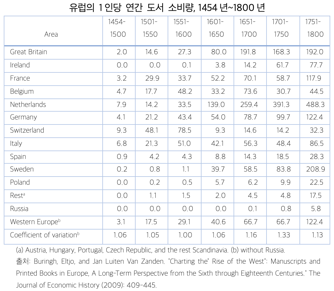 아래의 1인당 연간 책 소비량은 그 시대의 특징을 보다 정교하게 읽어낼 수 있다. 16세기 스위스의 1인당 책 소비는 전반기 48.1권, 후반기에는 78.5권으로 유럽 최고를 기록했다. 이는 스위스의 대도시 바젤과 제네바가 종교개혁의 중심지였기 때문이다. 17세기 이후 네덜란드의 최고 책 소비량은 그 상업적 발전과 관련이 있다. 18세기 중반 이후 프랑스의 책 소비량 증가는 정점에 이른 계몽주의와 무관하지 않다.