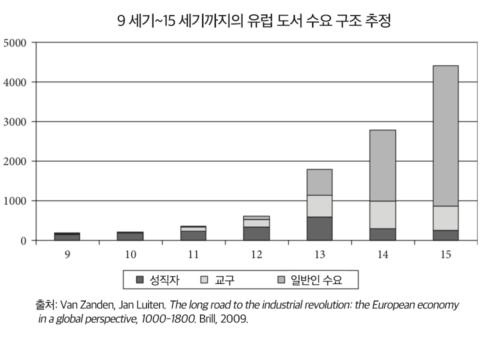 아래 도표를 보면 11세기~19세기 사이 유럽에서 책 소비자층의 급격한 변화를 볼 수 있다. 서기 1000년 이전까지 책의 주요 수요자는 오롯이 성직자뿐이었다. 11세기 들어 교구들이 두꺼운 네트워크를 형성하면서 책의 또 다른 수요층으로 등장했다. 그러나 13세기 이후 도시국가들이 성장하면서 책은 성직자와 교구보다는 도시 엘리트들에 의해 더 적극적으로 소비되었다. 14세기~15세기에 접어들면서 책의 60%~80%는 도시민의 수요에 의해 생산되었으며, '책 시장'이 본격적으로 형성되었다.