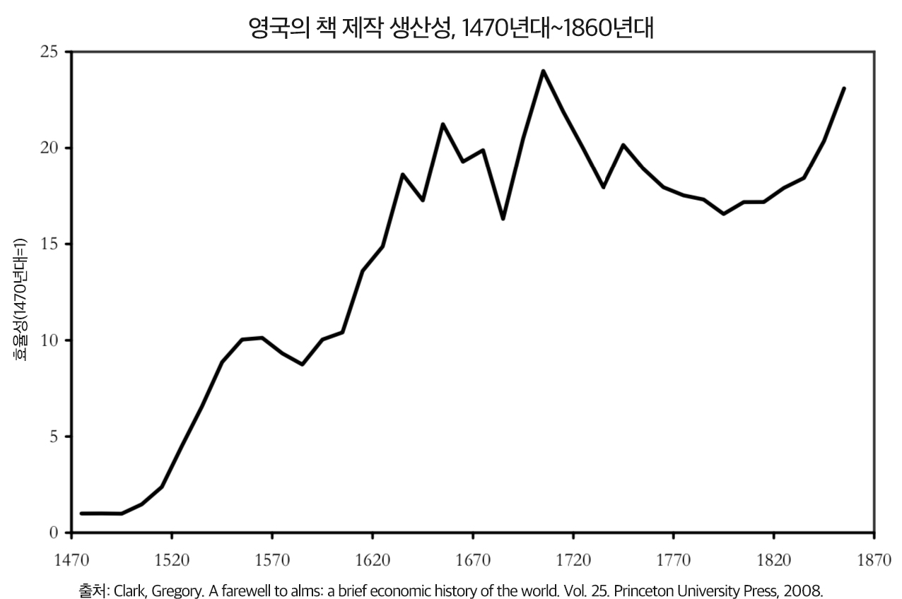 클라크(Clark, Gregory)는 건축 장인의 임금과 책 가격 간의 비율로 후속 생산성 향상을 측정하고 인쇄기 보급 후 첫 200년 동안 생산성이 20배 증가한 것을 발견했다. 생산성은 건축 장인의 임금과 표준 특성 장부의 가격 사이의 비율로 측정된다. 클라크는 "수작업과 인쇄기 양쪽 모두 책 제작에 드는 주된 비용은 인건비(종이 및 양피지 제작비는 주로 인건비였다)"라고 지적했다.