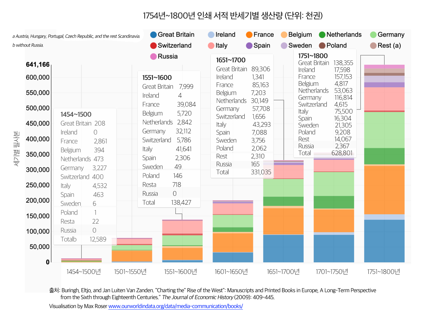 16세기 이후 프랑스의 지속적인 영향력 유지, 16세기 르네상스 시대 이탈리아의 부상, 17세기 상업의 발전에 따른 영국과 네덜란드의 부상, 15세기 종교개혁 및 18세기 프로이센의 등장에 따른 독일의 성장이 책의 출판량을 통해 명확하게 드러난다.