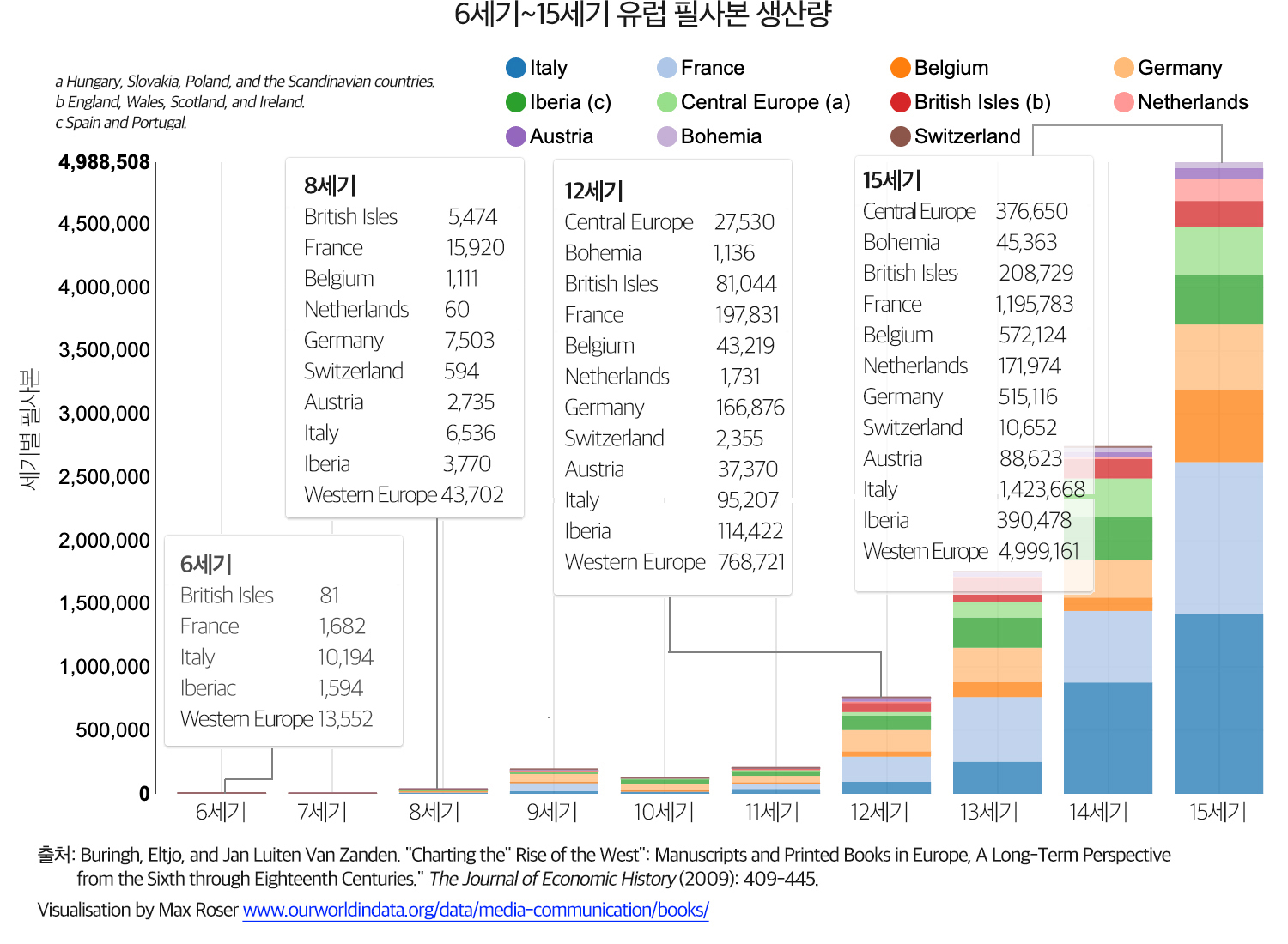 부링과 잔든(Buringh and Zanden)은 6세기 부터 16세기, 즉 중세와 초기 근대 서유럽의 필사본(manuscript)과 책의 생산 증가를 도시화, 수도원과 대학의 증가 등을 통해 추정했다. 부링과 잔든의 분석 단위는 필사본은 개별 필사본의 수, 인쇄된 책은 (신규) '서적'(title) 또는 '판'파이다. 저자들의 추정치가 보수적이고 "수치가 낮은 추정치로 해석되어야 한다"라는 점에 주목할 필요가 있다.