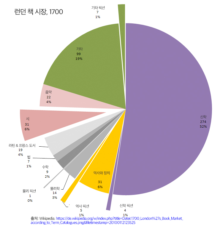 아래의 파이 차트 1700년 런던 도서 시장의 다양한 도서 주제에 대한 개요를 제공한다. 신학은 여전히 책 시장의 지배적 지위를 차지하지만 다른 장르 책들의 약진을 볼 수 있다.